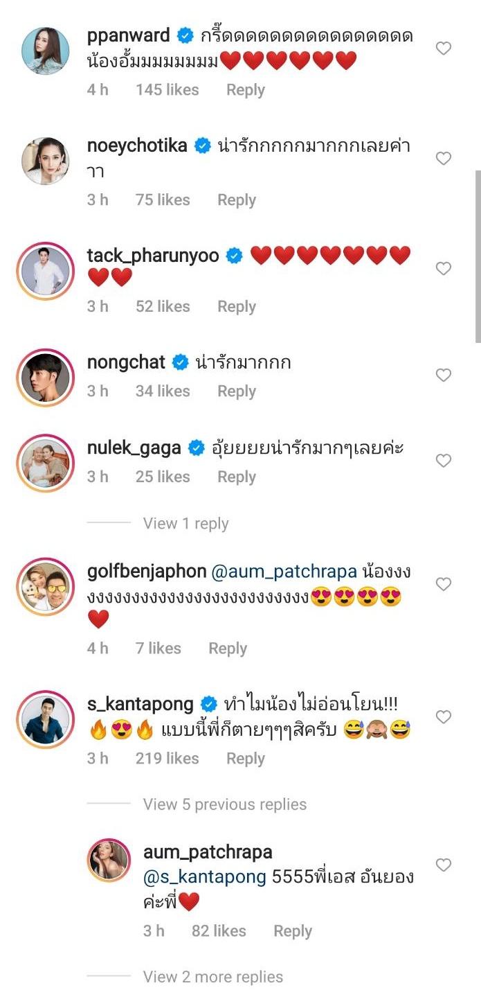 ทำเอาแฟนๆ รวมถึงคนในวงการบันเทิงแห่คอมเมนต์รัวๆ อาทิ ดีเจมะตูม เตชินท์ “น้อนนนนนนนนนนน ลุคนี้มัธยมมากกกก”, มิกค์ ทองระย้า “สวยมากคร้าบบบบบบ”, ตอง ภัครมัย “สวย”, เป้ย ปานวาด “กรี๊ดดดดดดดดดดดดดดดดน้องอั้มมมมมมมม”, เนย โชติกา “น่ารักกกกกมากกกเลยค่าาา” เอส กันตพงศ์ “ทำไมน้องไม่อ่อนโยน!!! แบบนี้พี่ก็ตายๆๆๆ สิครับ” ฯลฯ