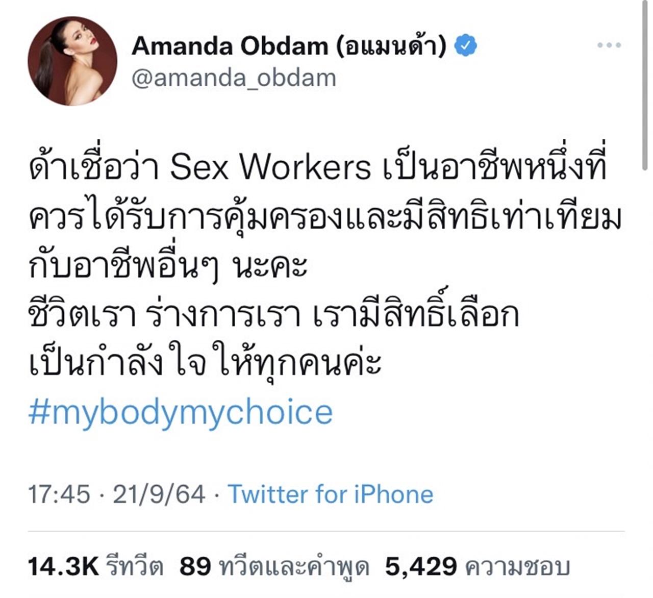 "ด้าเชื่อว่า Sex Workers เป็นอาชีพหนึ่งที่ควรได้รับการคุ้มครองและมีสิทธิเท่าเทียมกับอาชีพอื่นๆ นะคะ ชีวิตเรา ร่างกายเรา เรามีสิทธิ์เลือก เป็นกำลังใจให้ทุกคนค่ะ #mybodymychoice"