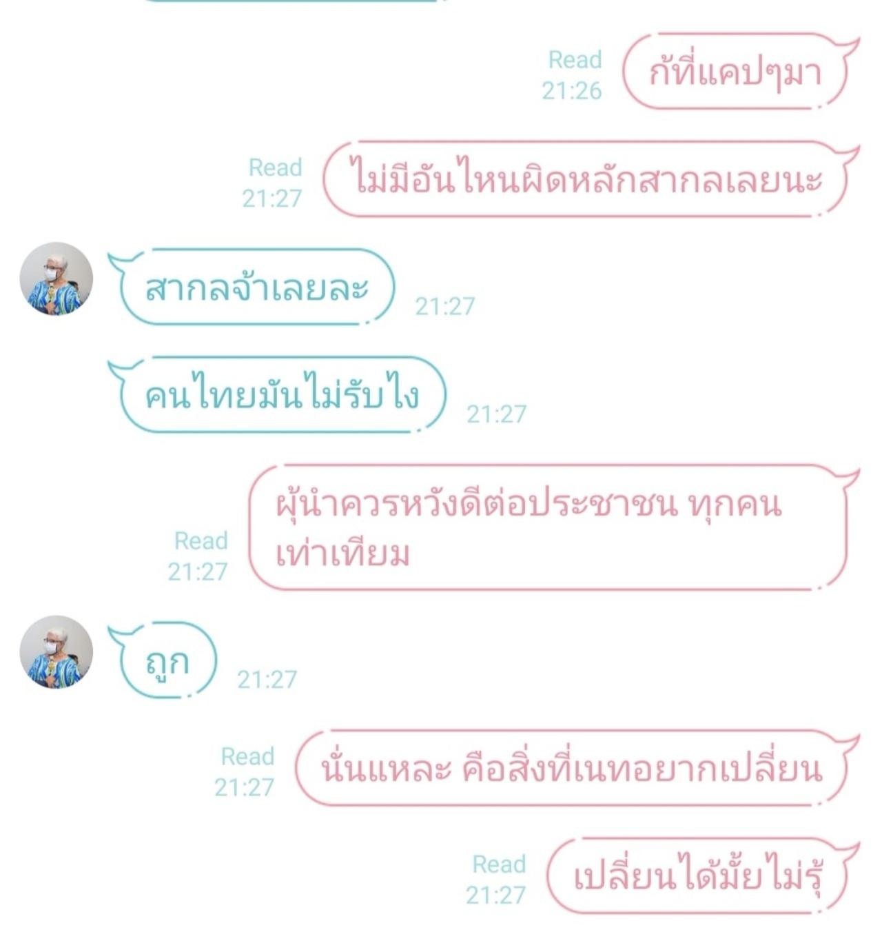 พร้อมยังเปิดเผยแชต ที่คุยกับแม่ด้วยดังนี้ เมื่อแม่มาบ่นว่า คนแคปรูปที่ติดเทรนด์ทวิตส่งไปให้เต็มเลย...I believe Miss Universe is looking for someone who represents "universal values" not just Thai.