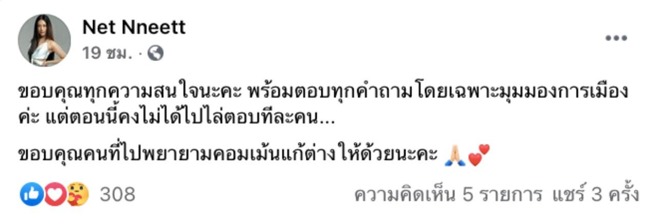 เนท ศิตานันท์ ได้โพสต์เฟซบุ๊กไปว่า "ขอบคุณทุกความสนใจนะคะ พร้อมตอบทุกคำถามโดยเฉพาะมุมมองการเมืองค่ะ แต่ตอนนี้คงไม่ได้ไปไล่ตอบทีละคน...ขอบคุณคนที่ไปพยายามคอมเม้นแก้ต่างให้ด้วยนะคะ"