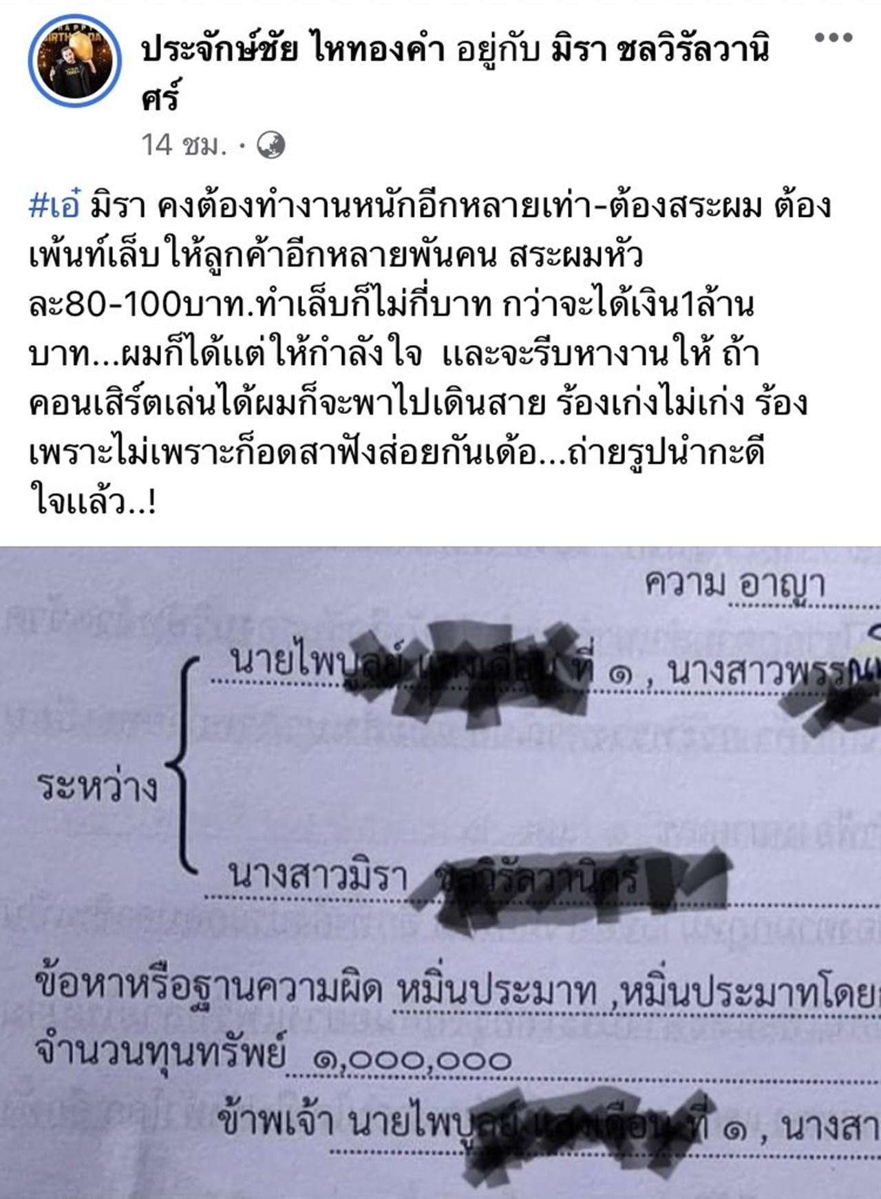 จากนั้น ประจักษ์ชัย ก็ได้โพสต์ภาพหมายศาลพร้อมเขียนว่า "#เอ๋ มิรา คงต้องทำงานหนักอีกหลายเท่า-ต้องสระผม ต้องเพนต์เล็บให้ลูกค้าอีกหลายพันคน สระผมหัวละ 80-100 บาท ทำเล็บก็ไม่กี่บาท กว่าจะได้เงิน 1 ล้านบาท...ผมก็ได้เเต่ให้กำลังใจ เเละจะรีบหางานให้ ถ้าคอนเสิร์ตเล่นได้ผมก็จะพาไปเดินสาย ร้องเก่งไม่เก่ง ร้องเพราะไม่เพราะก็อดสาฟังส่อยกันเด้อ...ถ่ายรูปนำกะดีใจเเล้ว..!"