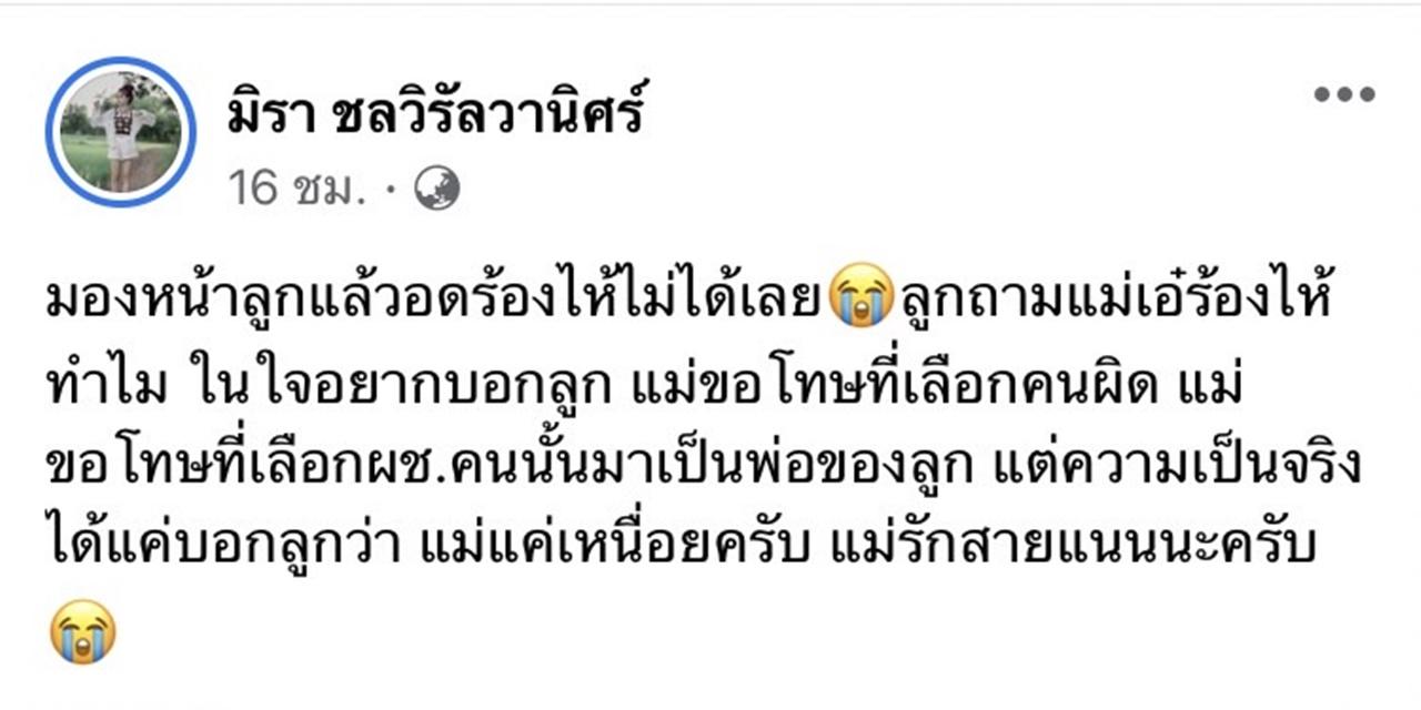 "มองหน้าลูกแล้วอดร้องไห้ไม่ได้เลย ลูกถามแม่เอ๋ร้องไห้ทำไม ในใจอยากบอกลูก แม่ขอโทษที่เลือกคนผิด แม่ขอโทษที่เลือก ผช.คนนั้นมาเป็นพ่อของลูก แต่ความเป็นจริงได้แค่บอกลูกว่า แม่แค่เหนื่อยครับ แม่รักสายแนนนะครับ"