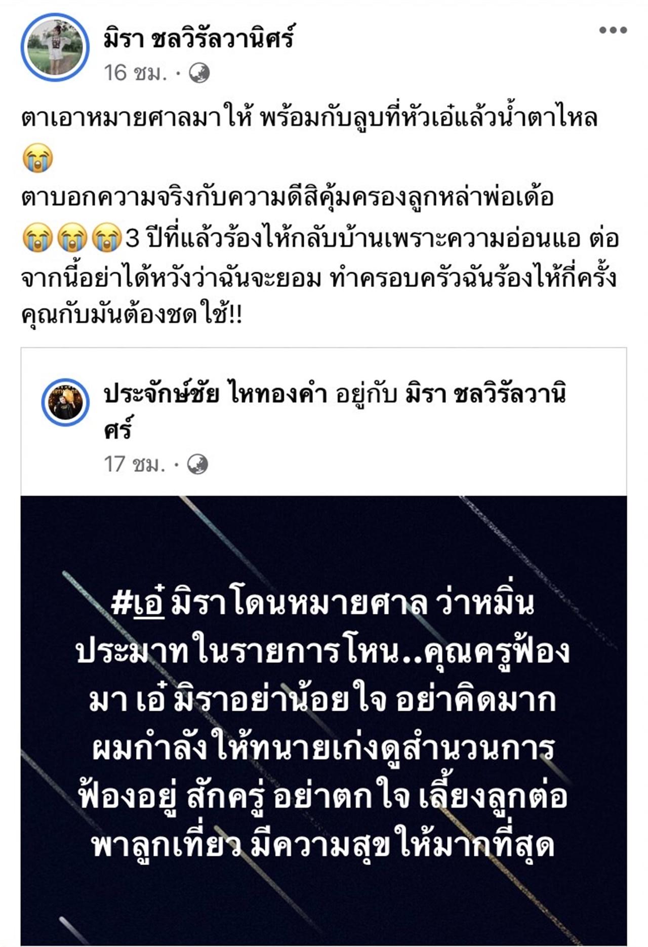แต่ล่าสุดกลับเป็นเรื่องเป็นราวขึ้นอีกครั้ง โดย นายห้างประจักษ์ชัย ไหทองคำ ได้โพสต์เฟซบุ๊กแจ้งว่า เอ๋ มิรา ชลวิรัลวานิศร์ ถูกอดีตสามี ครูไพบูลย์ แสงเดือน ฟ้องหมิ่นประมาท "#เอ๋ มิราโดนหมายศาล ว่าหมิ่นประมาทในรายการโหน..คุณครูฟ้องมา เอ๋ มิรา อย่าน้อยใจ อย่าคิดมาก ผมกำลังให้ทนายเก่งดูสำนวนการฟ้องอยู่ สักครู่ อย่าตกใจ เลี้ยงลูกต่อ พาลูกเที่ยว มีความสุขให้มากที่สุด"