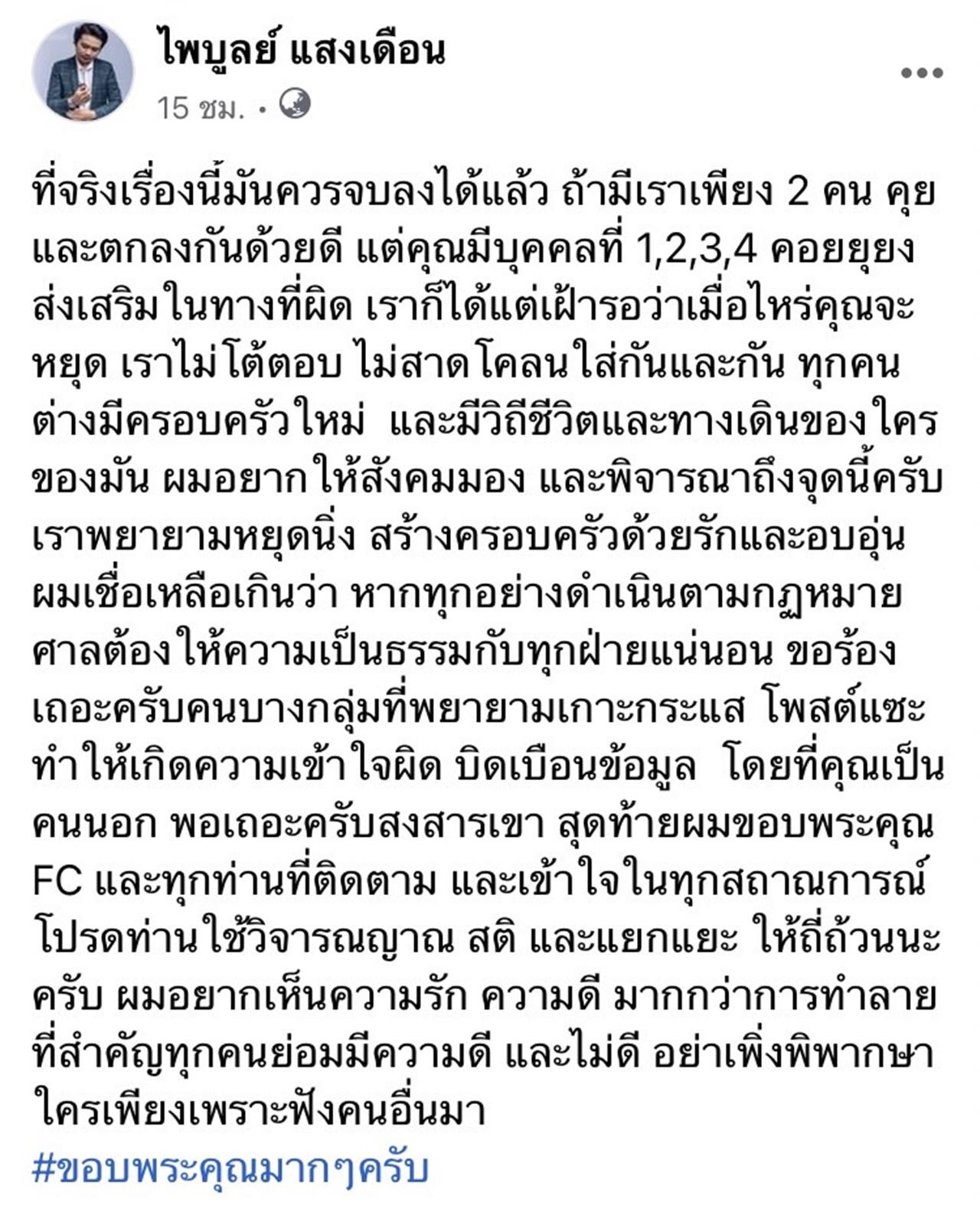 เราพยายามหยุดนิ่ง สร้างครอบครัวด้วยรักและอบอุ่น ผมเชื่อเหลือเกินว่า หากทุกอย่างดำเนินตามกฎหมาย ศาลต้องให้ความเป็นธรรมกับทุกฝ่ายแน่นอน ขอร้องเถอะครับคนบางกลุ่มที่พยายามเกาะกระแส โพสต์แซะ ทำให้เกิดความเข้าใจผิด บิดเบือนข้อมูล โดยที่คุณเป็นคนนอก พอเถอะครับสงสารเขา
