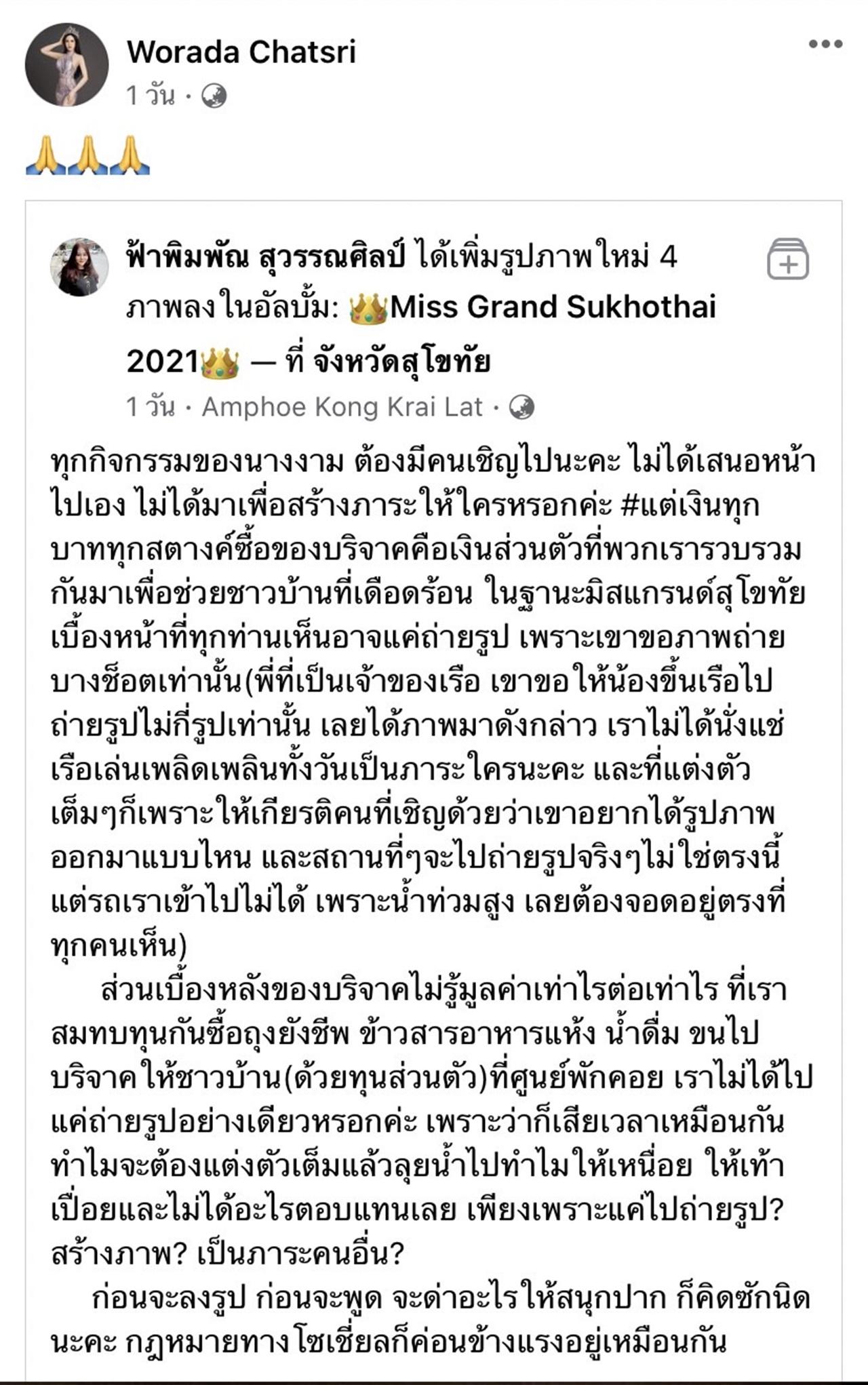 "ทุกกิจกรรมของนางงาม ต้องมีคนเชิญไปนะคะ ไม่ได้เสนอหน้าไปเอง ไม่ได้มาเพื่อสร้างภาระให้ใครหรอกค่ะ #แต่เงินทุกบาททุกสตางค์ซื้อของบริจาคคือเงินส่วนตัวที่พวกเรารวบรวมกันมาเพื่อช่วยชาวบ้านที่เดือดร้อน ในฐานะมิสแกรนด์สุโขทัย