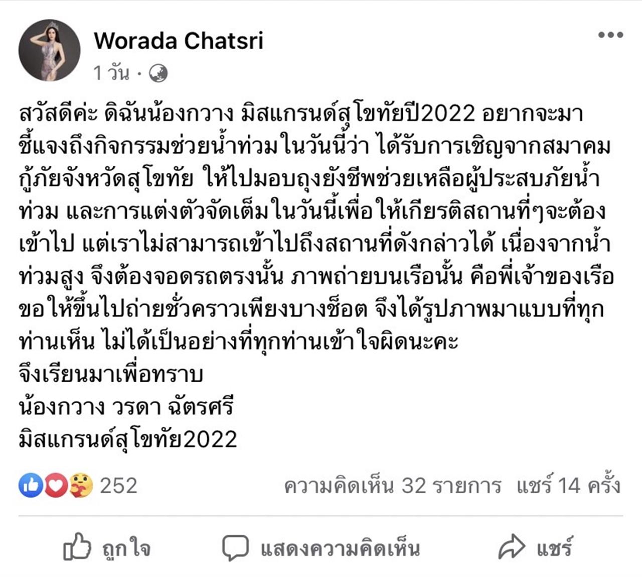 ล่าสุด กวาง วรดา ฉัตรศรี มิสแกรนด์สุโขทัย 2022 ก็ได้โพสต์ข้อความผ่านทางเฟซบุ๊กเพื่อชี้แจงถึงกรณีดังกล่าวที่หลายคนติงมาเรื่องการแต่งกาย มีใจความดังนี้ว่า