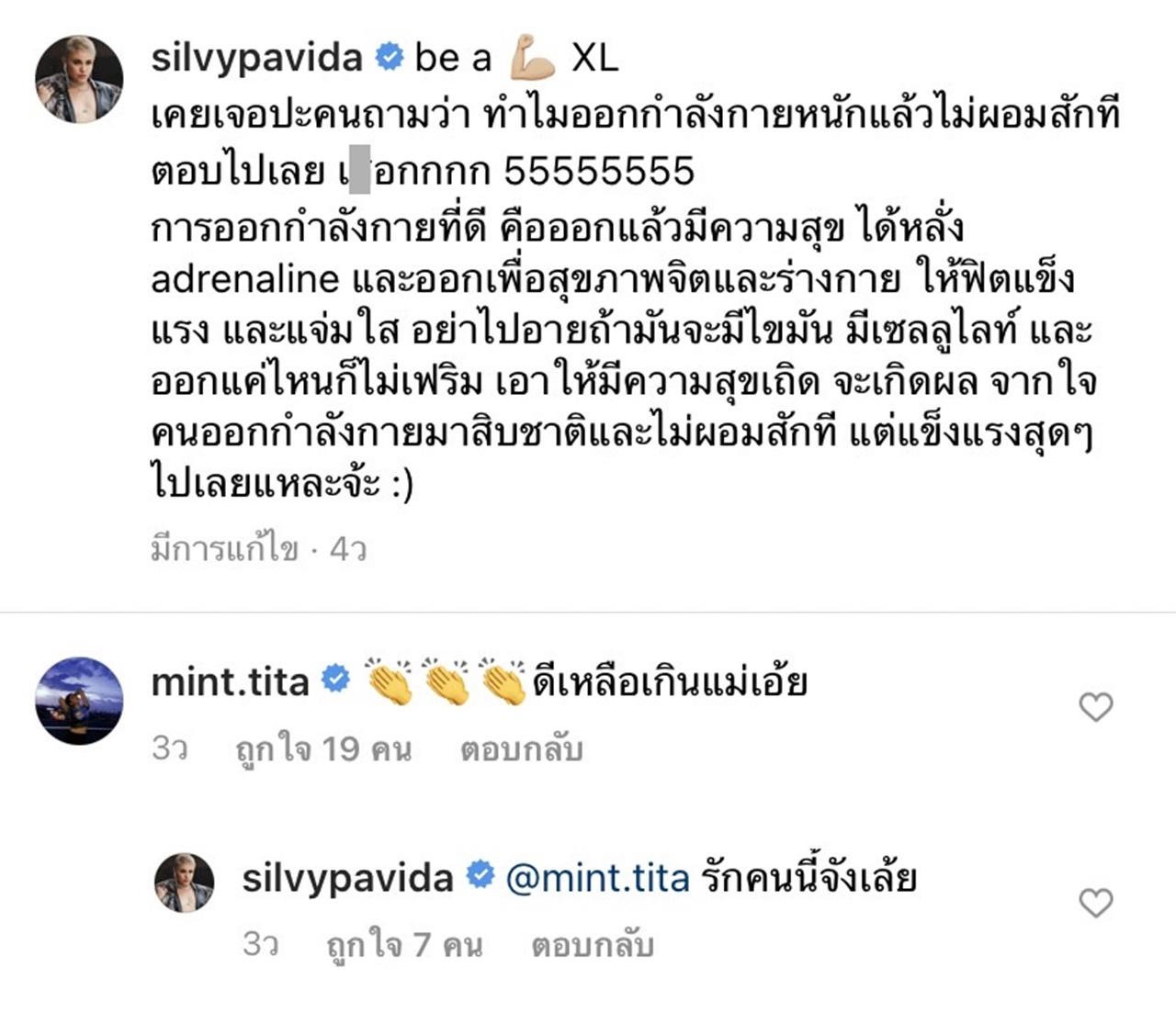 งานนี้ก็มีแฟนๆ เข้ามาคอมเมนต์และกดไลค์ให้แบบรัวๆ แถมเพื่อนสาวคนสนิทอย่าง มิ้น มิณฑิตา ก็ได้เข้ามาคอมเมนต์บอกว่า "ดีเหลือเกินแม่เอ้ย" งานนี้ ซิลวี่ ก็ได้คอมเมนต์ตอบกลับทันทีว่า "รักคนนี้จังเล้ย"