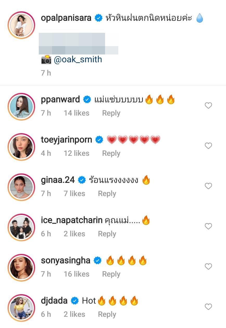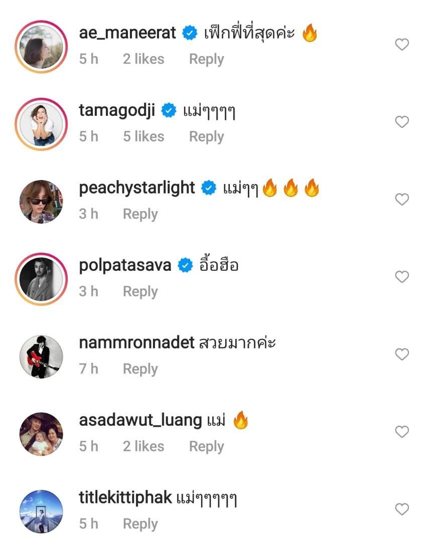 ท่ามกลางคอมเมนต์ของคนในวงการบันเทิงที่แซวความแซ่บของคุณแม่ลูกแฝด อาทิ เป้ย ปานวาด “แม่แซ่บบบบบ”, จีน่า วิรายา “ร้อนแรงงงงงง”, ไอซ์ ณพัชรินทร์ “คุณแม่.....”, เอ๋ มณีรัตน์ “เฟ็กฟี่ที่สุดค่ะ” ฯลฯ พร้อมทั้งส่งอีโมจิไฟลุกแบบรัวๆ เต็มไอจี.