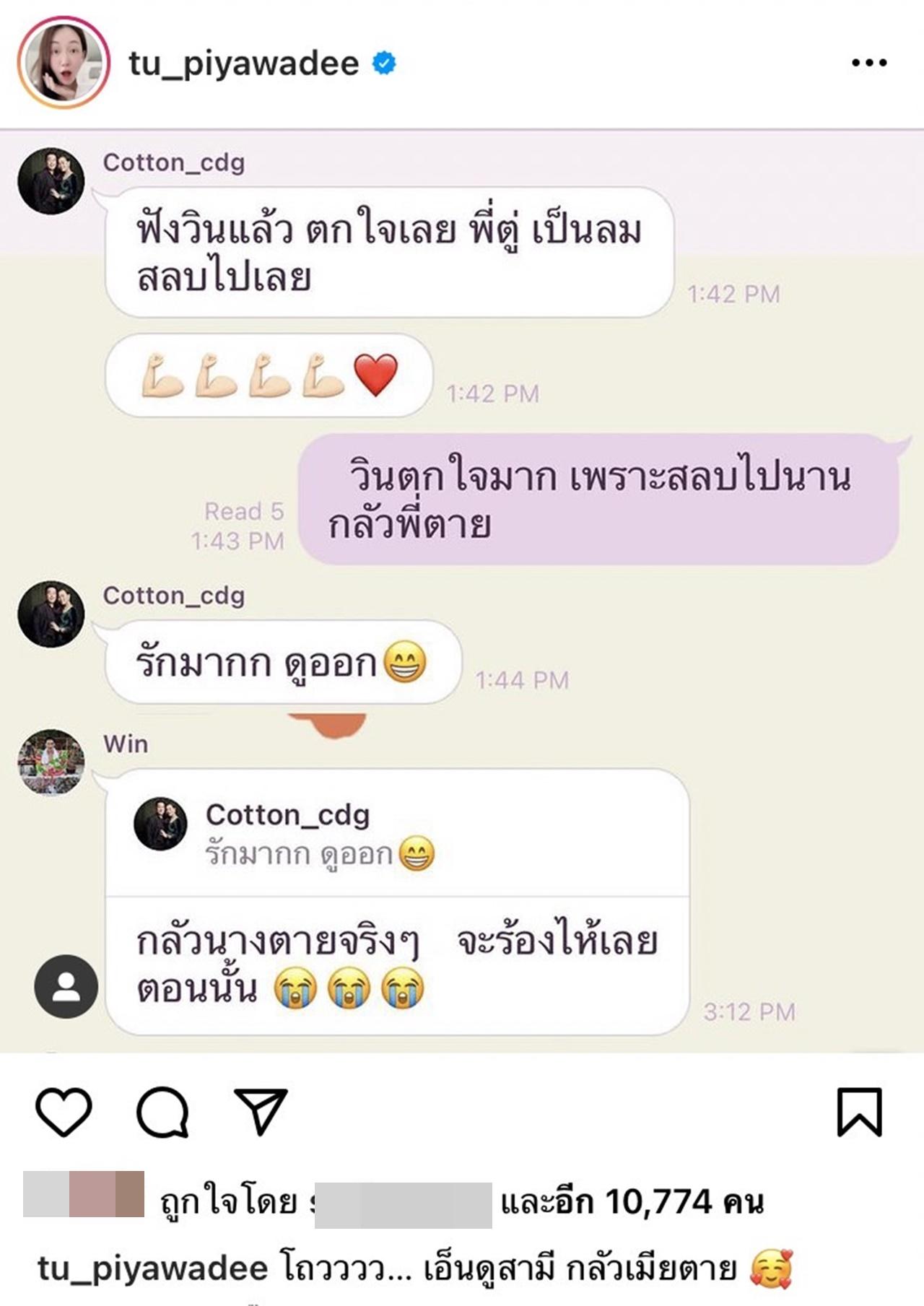 ซึ่งล่าสุด ตู่ ก็ได้เผยแชตข้อความที่สามีหนุ่ม มาวิน ตกใจหนักมากจนเกือบร้องไห้ เพราะไม่เคยเห็นภรรยาสุดที่รักมีอาการหนักขนาดนี้ และสลบไปนานมาก โดยในแชตดังกล่าว มาวิน ได้เขียนว่า "กลัวนางตายจริงๆ จะร้องไห้เลยตอนนั้น" ซึ่ง ตู่ ก็ได้แคปข้อความ พร้อมกับโพสต์ผ่านอินสตาแกรมบอกว่า "โถวววว… เอ็นดูสามี กลัวเมียตาย".