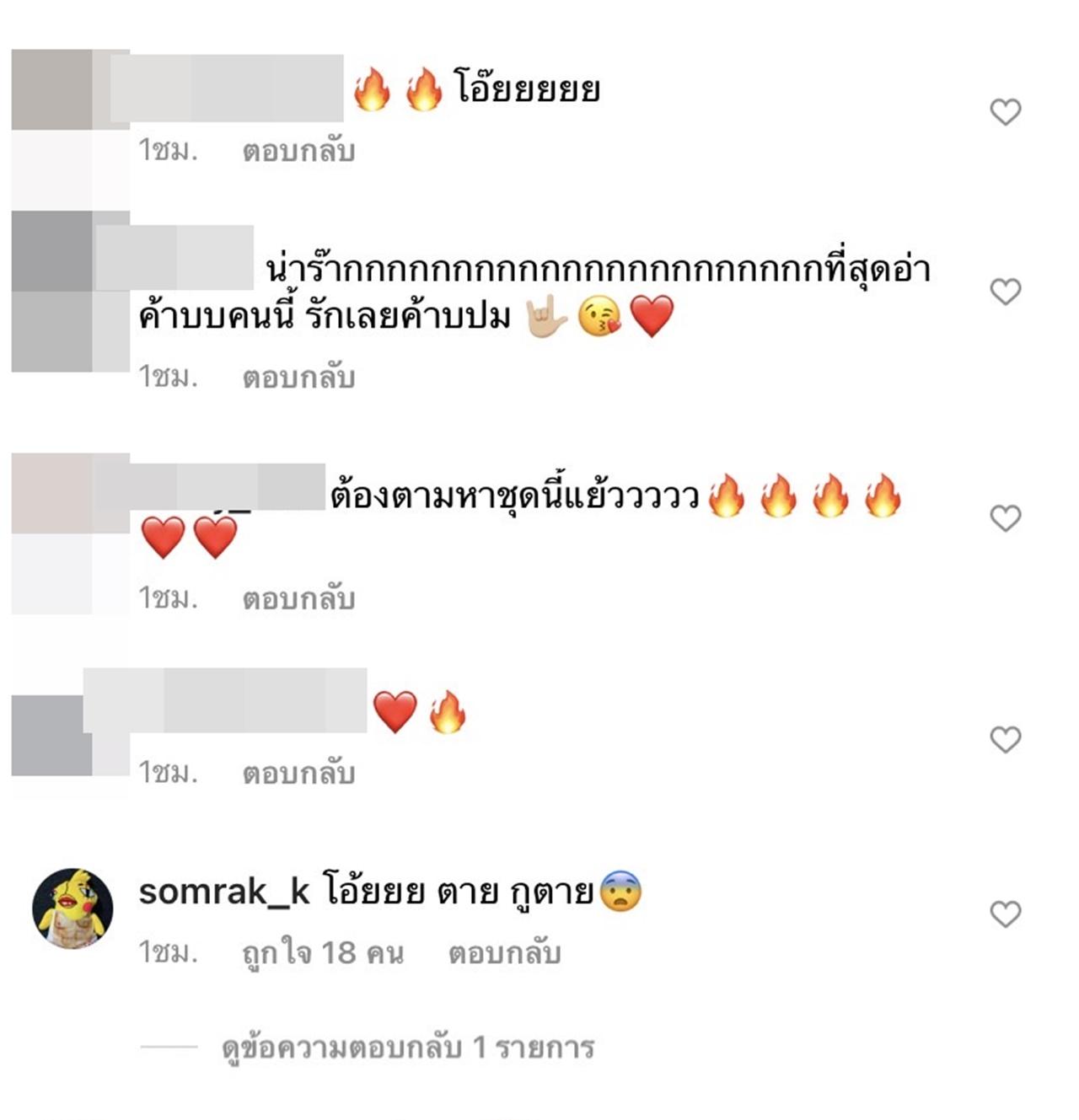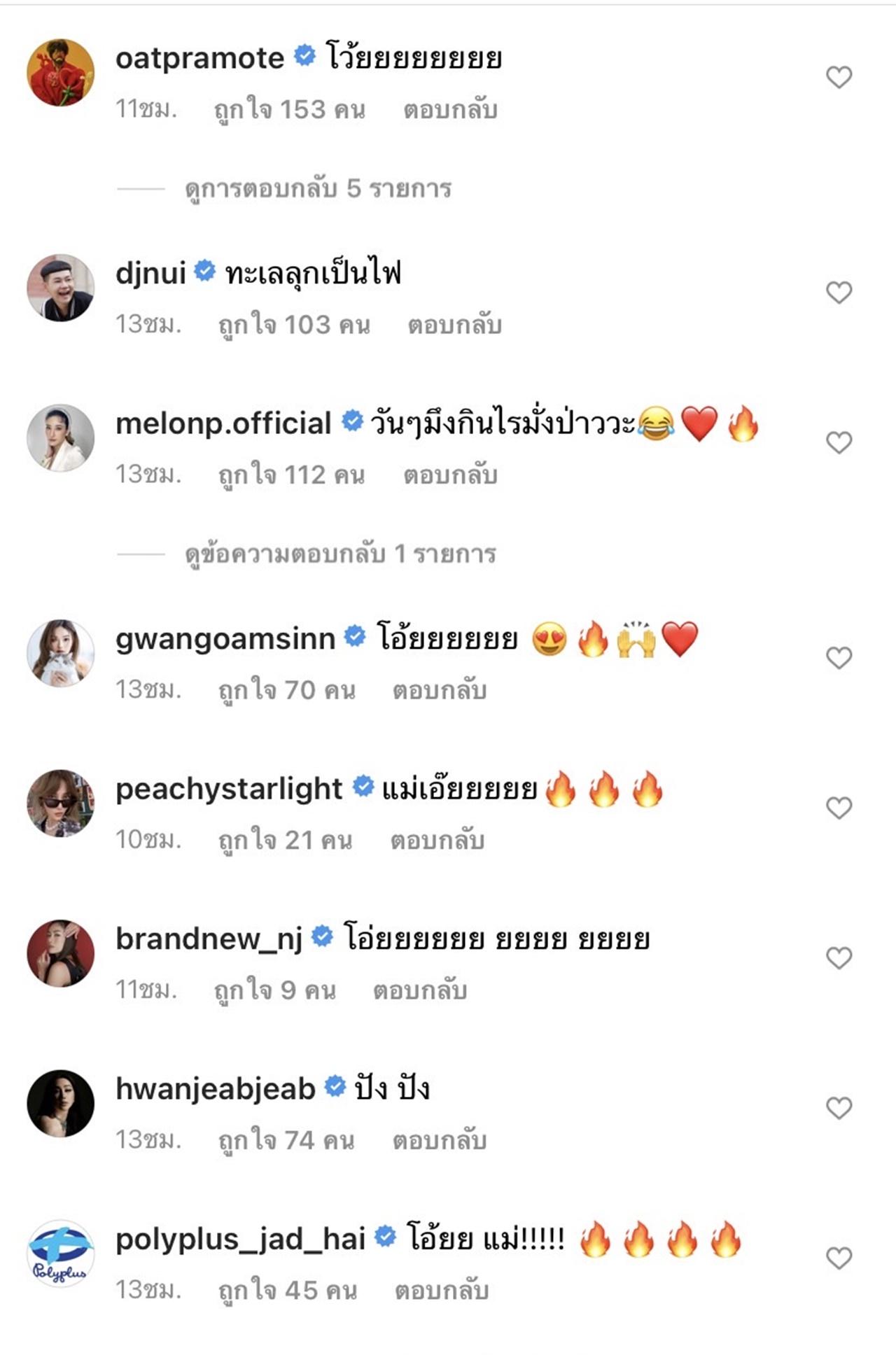 แม้จะเป็นรอยยิ้มที่สดใสแต่ความแซ่บนั้นกระแทกตากระแทกใจหนุ่มๆ อย่างจัง จนทำให้ อีเจี๊ยบ เลียบด่วน แฟนคลับนัมเบอร์วันของสาวไอซ์ต้องเข้ามาคอมเมนต์ถึงความแซ่บด้วยว่า "โอ้ยยย ตาย กูตาย" ส่วน โอ๊ต ปราโมทย์ ก็เข้ามาคอมเมนต์เช่นกันว่า "โว้ยยยยยยยย"