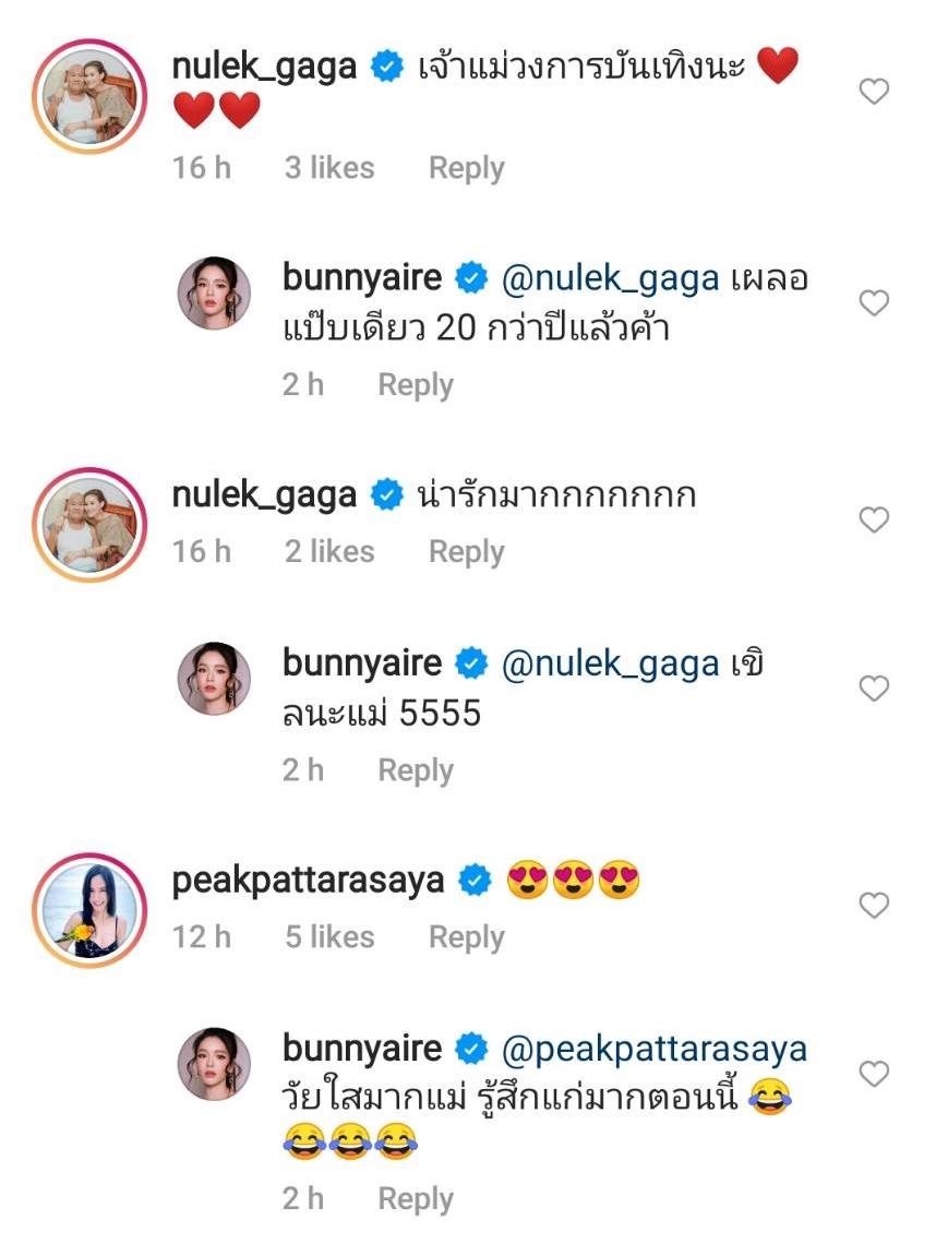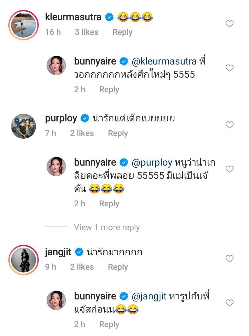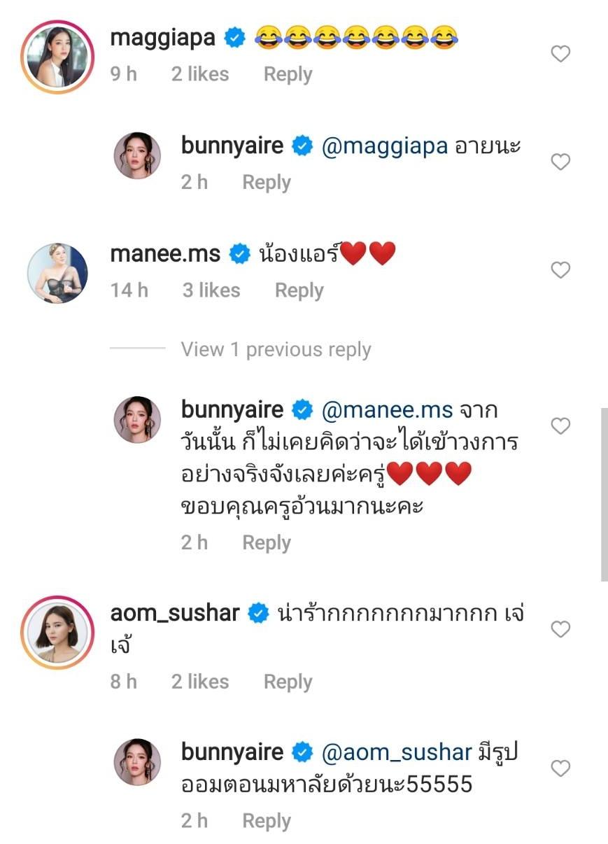 ท่ามกลางคอมเมนต์แซวจากเพื่อนๆ ในวงการ อาทิ เนย โชติกา, หนูเล็ก ก่อนบ่าย, พีค ภัทรศยา, เกลือ กิตติ, แม็กกี้ อาภา ฯลฯ แต่ที่ฮาสุดเห็นจะเป็นคอมเมนต์จากนักแสดงหนุ่มแซ่บ แทค ภรัณยู ที่เข้ามาแซวว่า “เอาสมัย คลับซ่า ไหม” และแอร์ตอบกลับว่า “5555 โคดน่ากัวอะพี่ งงทำไมหนูถึงได้เข้าวงการ”.