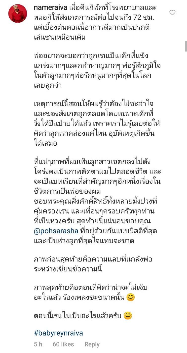 จากนั้นเนมก็เล่าเรื่องนี้ต่อในคอมเมนต์ใต้ภาพไว้ว่า “เมื่อคืนก็พักที่โรงพยาบาลและหมอก็ให้สังเกตการณ์ต่อไปจนถึง 72 ชม. แต่เบื้องต้นตอนนี้อาการดีมากเป็นปรกติ เล่นซนเหมือนเดิม พ่ออยากจะบอกว่าลูกเรนเป็นเด็กที่แข็งแกร่งมากๆ และกล้าหาญมากๆ พ่อรู้สึกภูมิใจในตัวลูกมากๆ พ่อรักหนูมากๆ ที่สุดในโลกเลยลูกจ๋า