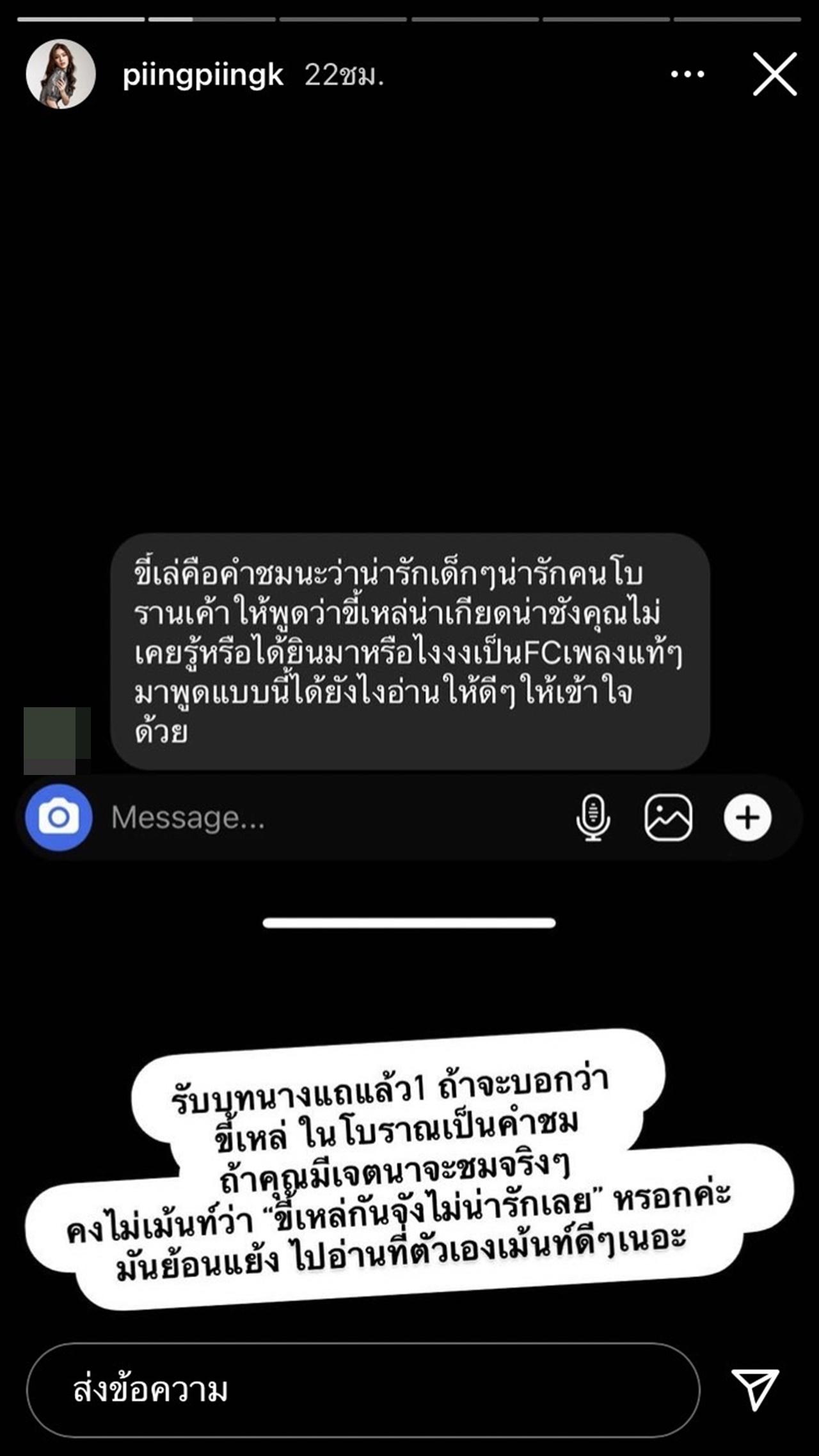 จากนั้นชาวเน็ตคนดังกล่าวก็ได้ส่งข้อความอธิบายว่า "ขี้เหร่คือคำชมนะว่าเด็กๆ น่ารัก คนโบราณเขาให้พูดว่าขี้เหร่ น่าเกลียด น่าชัง คุณไม่เคยรู้หรือได้ยินมาหรือยังไง งง เป็นFCเพลงแท้ๆ มาพูดแบบนี้ได้ยังไง อ่านให้ดีๆ ให้เข้าใจด้วย"