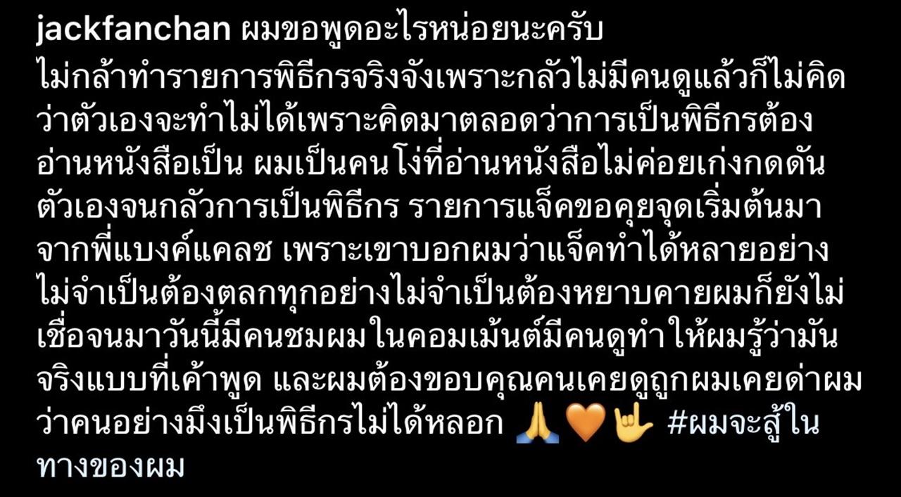 ไม่จำเป็นต้องหยาบคายผมก็ยังไม่เชื่อ จนมาวันนี้มีคนชมผมในคอมเมนต์มีคนดู ทำให้ผมรู้ว่ามันจริงแบบที่เค้าพูด และผมต้องขอบคุณคนเคยดูถูกผมเคยด่าผมว่าคนอย่างมึงเป็นพิธีกรไม่ได้หรอก #ผมจะสู้ในทางของผม"
