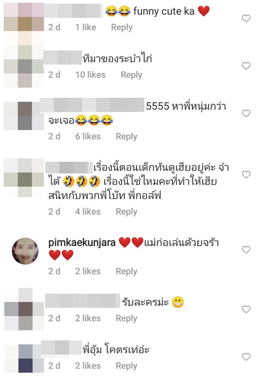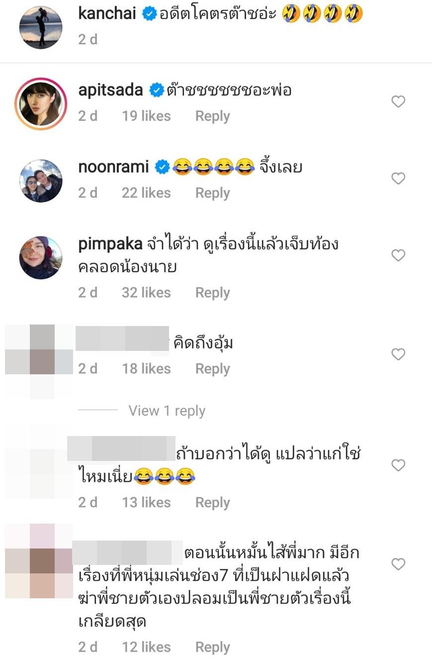 ทำเอาคนในวงการบันเทิงแซว อาทิ ไอซ์ อภิษฎา “ต๊าชชชชชชอะพ่อ”, นุ่น รมิดา “จึ้งเลย” และใส่อีโมจิขำน้ำตาไหล, หมู พิมพ์ผกา “จำได้ว่า ดูเรื่องนี้แล้วเจ็บท้องคลอดน้องนาย” รวมไปถึงแฟนๆ ที่เข้ามาคอมเมนต์ อาทิ ถ้าบอกว่าได้ดู แปลว่าแก่ใช่ไหมเนี่ย, ที่มาของระบำไก่, 5555 หาพี่หนุ่มกว่าจะเจอ ฯลฯ.