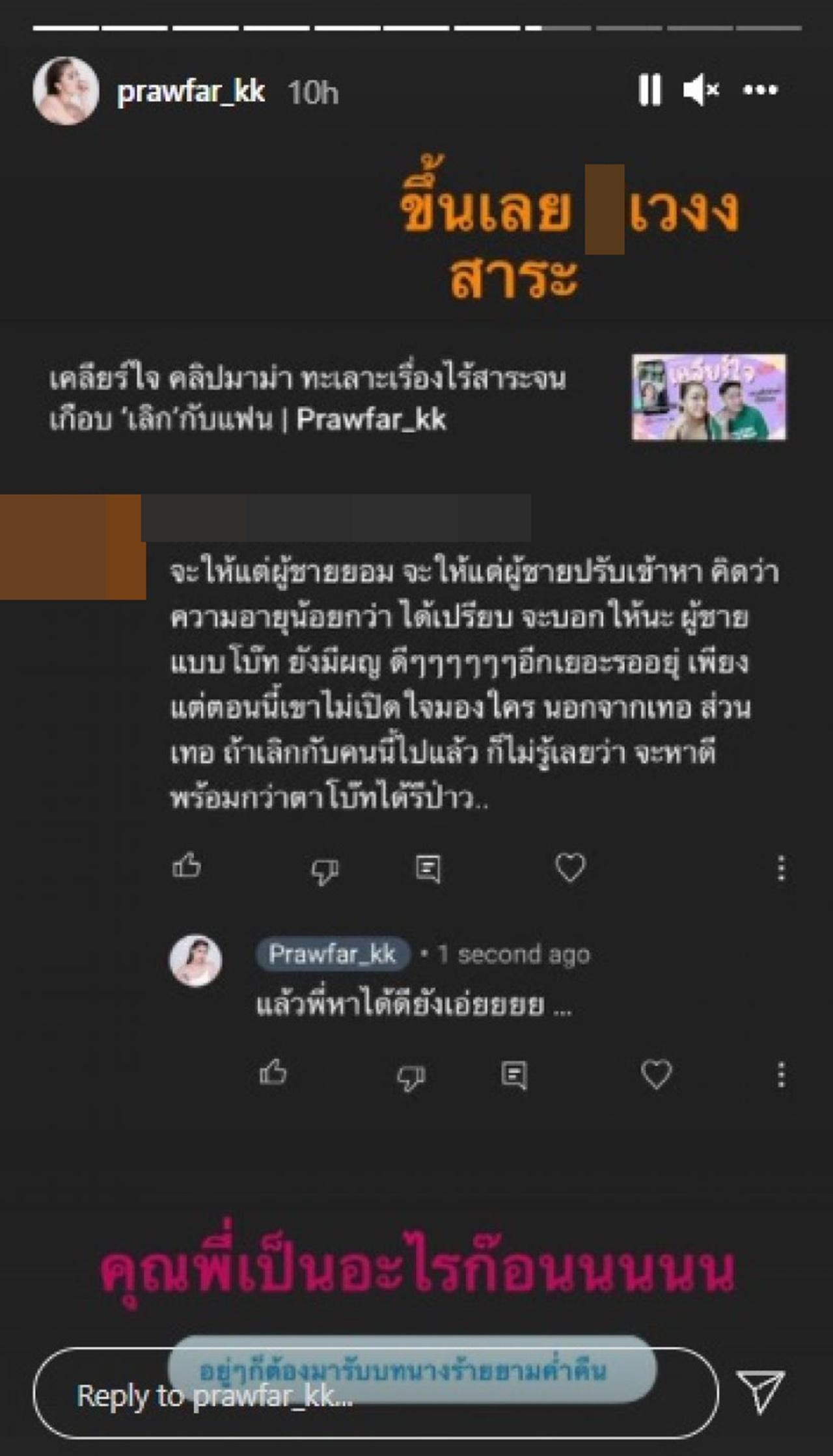 แต่หลังจากที่ พราว การัญชิดา โพสต์คลิปลงไป ก็มีชาวเน็ตเข้ามาแซะแรงว่า "จะให้แต่ผู้ชายยอม จะให้แต่ผู้ชายปรับเข้าหา คิดว่าความอายุน้อยกว่าได้เปรียบ