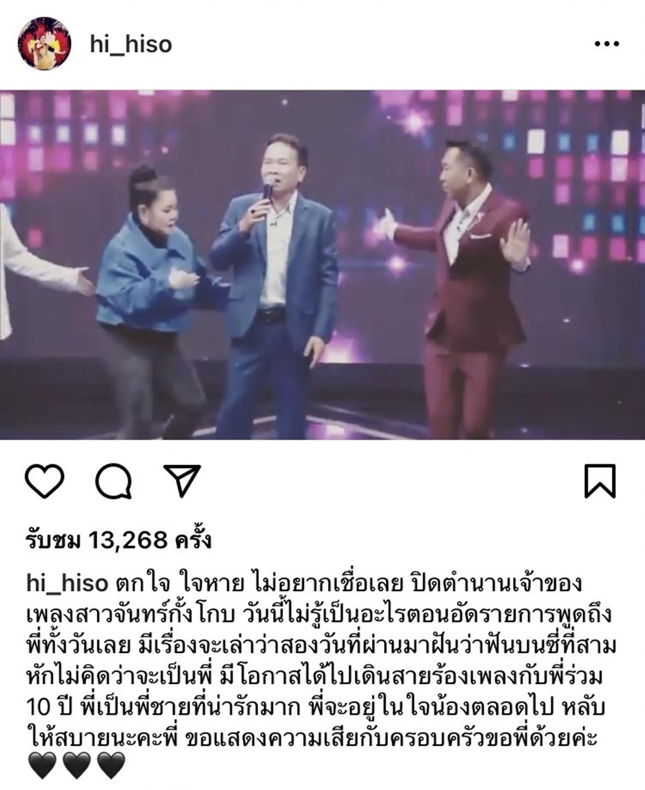 "ตกใจ ใจหาย ไม่อยากเชื่อเลย ปิดตำนานเจ้าของเพลงสาวจันทร์กั้งโกบ วันนี้ไม่รู้เป็นอะไรตอนอัดรายการพูดถึงพี่ทั้งวันเลย มีเรื่องจะเล่าว่าสองวันที่ผ่านมาฝันว่าฟันบนซี่ที่สามหักไม่คิดว่าจะเป็นพี่ มีโอกาสได้ไปเดินสายร้องเพลงกับพี่ร่วม 10 ปี พี่เป็นพี่ชายที่น่ารักมาก พี่จะอยู่ในใจน้องตลอดไป หลับให้สบายนะคะพี่ ขอแสดงความเสียใจกับครอบครัวของพี่ด้วยค่ะ".