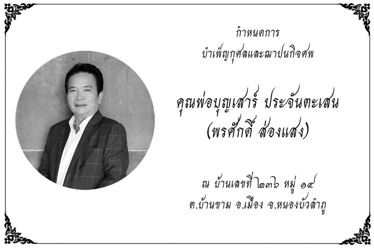 ล่าสุดเฟซบุ๊กแฟนเพจ Pornsak Songsang - พรศักดิ์ ส่องแสง ได้โพสต์แจ้งกำหนดการบำเพ็ญกุศลและฌาปนกิจ คุณพ่อบุญเสาร์ ประจันตะเสน (พรศักดิ์ ส่องแสง) โดยงานจะตั้งอยู่บ้านเลขที่ 236 หมู่ 14 ต.บ้านขาม อ.เมือง จ.หนองบัวลำภู จัดขึ้นในวันที่ 16-20 ต.ค. กำหนดการดังนี้