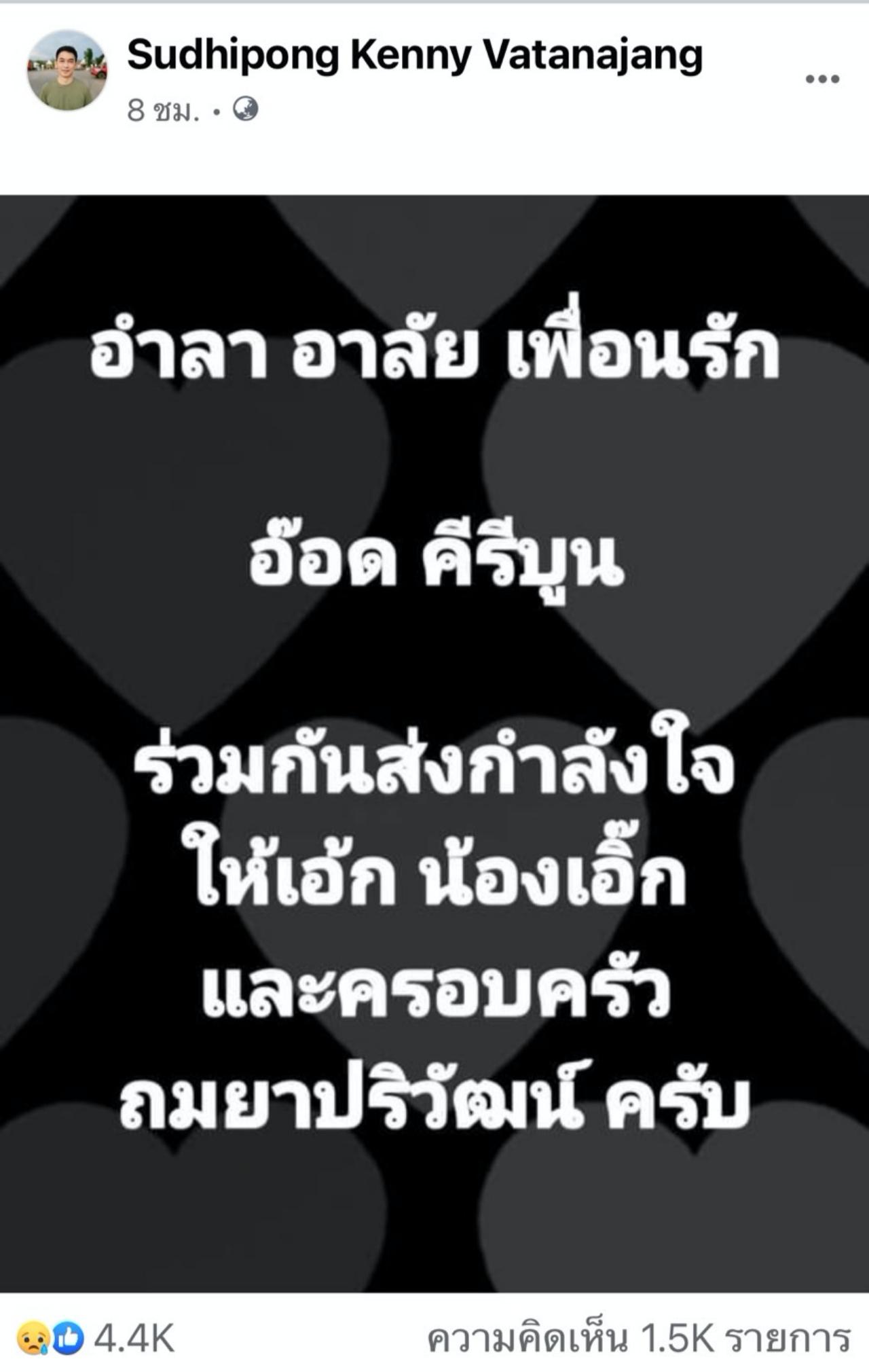 Sudhipong Kenny Vatanajang ว่า อำลา อาลัย เพื่อนรัก อ๊อด คีรีบูน ขอร่วมกันส่งกำลังใจ ให้เอ้ก น้องเอิ๊ก และ ครอบครัว ถมยาปริวัฒน์ ครับ