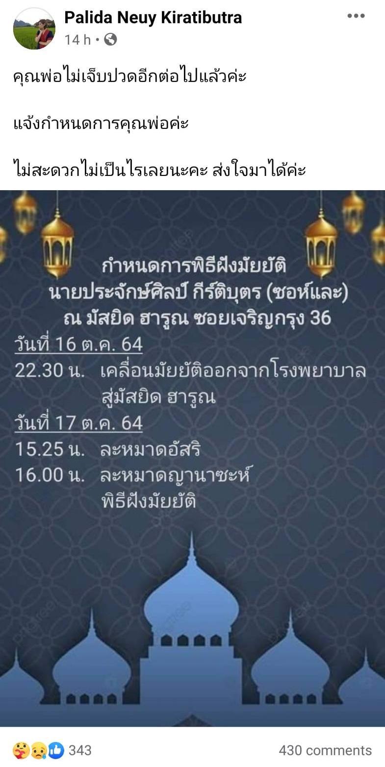 ซึ่ง เนย ปาลิดา กีรติบุตร ลูกสาว ได้โพสต์ข้อความแจ้งข่าวการจากไปของคุณพ่อว่า “คุณพ่อไม่เจ็บปวดอีกต่อไปแล้วค่ะ แจ้งกำหนดการคุณพ่อค่ะ ไม่สะดวกไม่เป็นไรเลยนะคะ ส่งใจมาได้ค่ะ” โดยในกำหนดการพิธีฝังมัยยัติ จะจัดขึ้น ณ มัสยิดฮารูณ ซ.เจริญกรุง 36 โดยในวันนี้ (17 ต.ค. 2564) เวลา 15.25 น. จะมีพิธีละหมาดอัสริ และ 16.00 น. จะมีพิธีละหมาดญานาซะห์ และพิธีฝังมัยยัติ