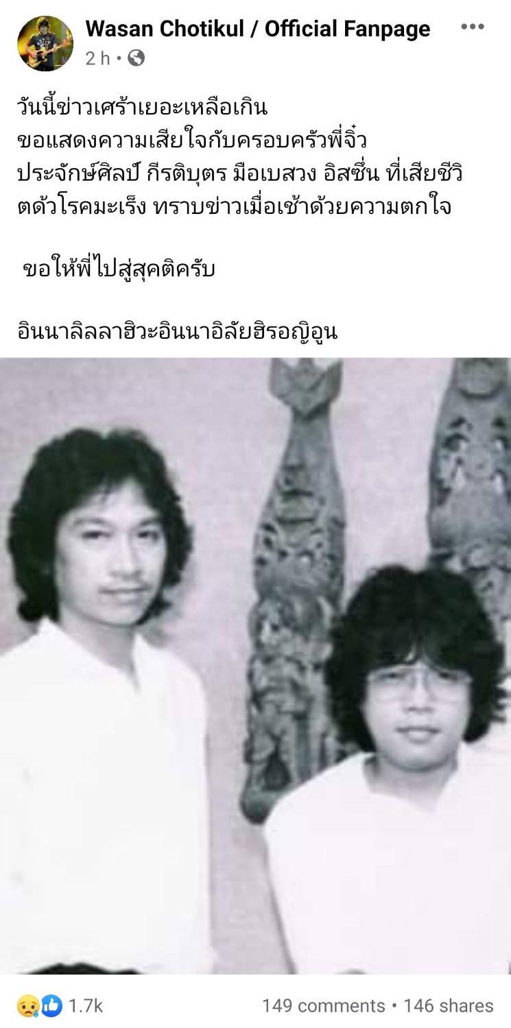 ด้านนักร้องนักดนตรีดัง โต๊ะ วสันต์ โชติกุล ซึ่งเคยร่วมงานกับจิ๋วเมื่อครั้งตั้งวง Isn’t ก็ได้โพสต์ภาพคู่พร้อมทั้งเขียนข้อความว่า “วันนี้ข่าวเศร้าเยอะเหลือเกิน ขอแสดงความเสียใจกับครอบครัวพี่จิ๋ว ประจักษ์ศิลป์ กีรติบุตร มือเบสวง อิสซึ่น ที่เสียชีวิตด้วยโรคมะเร็ง ทราบข่าวเมื่อเช้าด้วยความตกใจ ขอให้พี่ไปสู่สุคติครับ อินนาลิลลาฮิวะอินนาอิลัยฮิรอญิอูน”