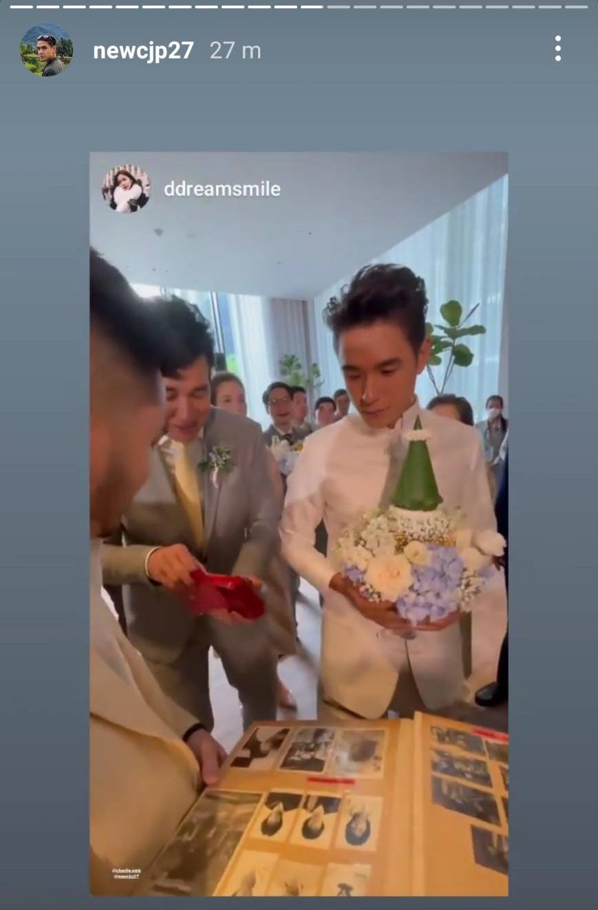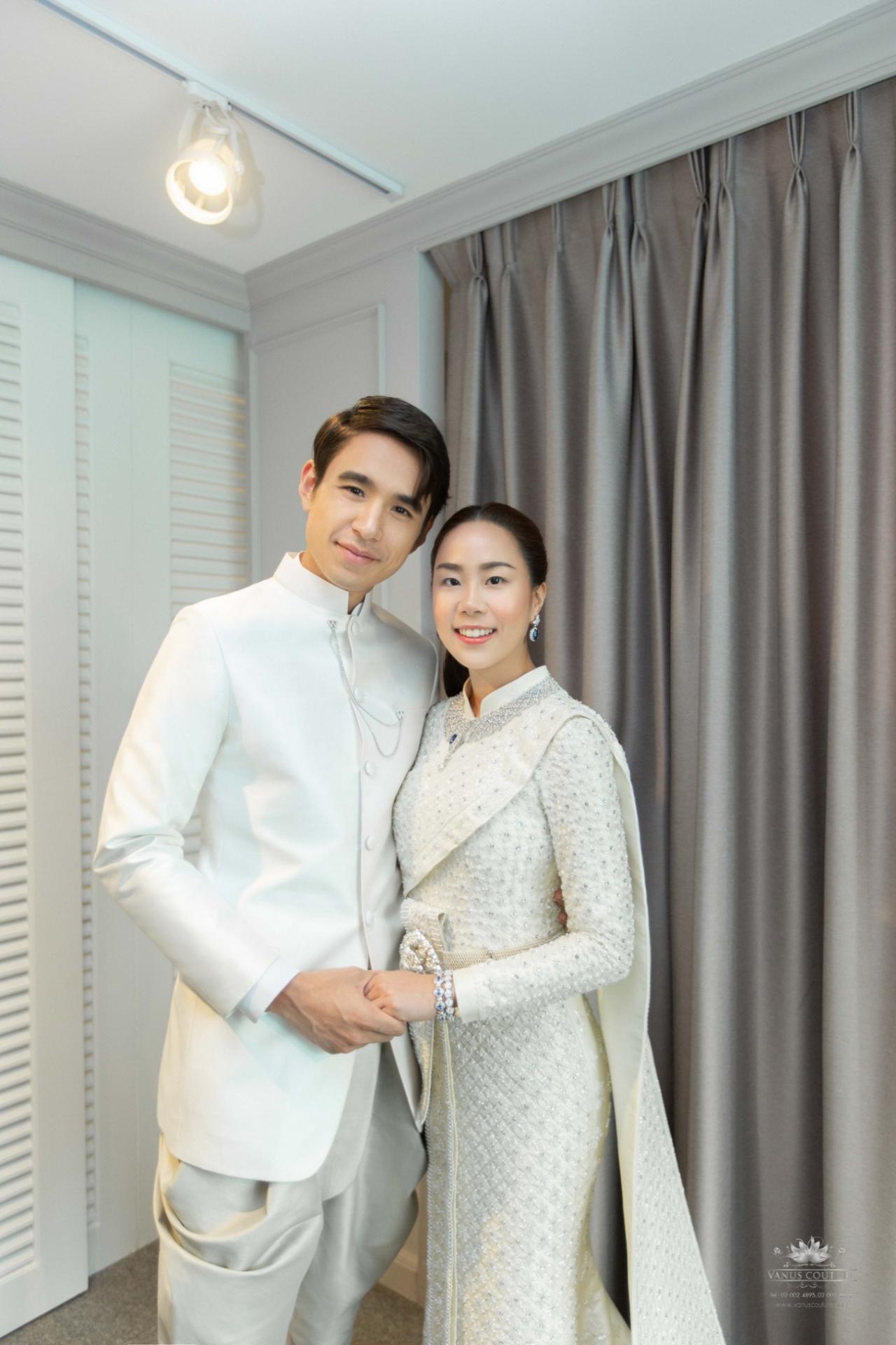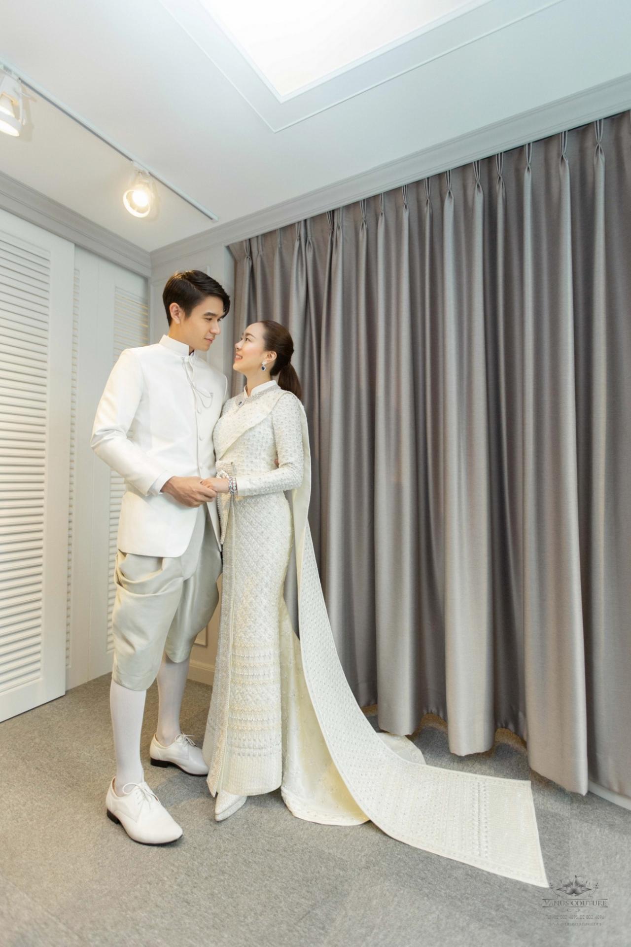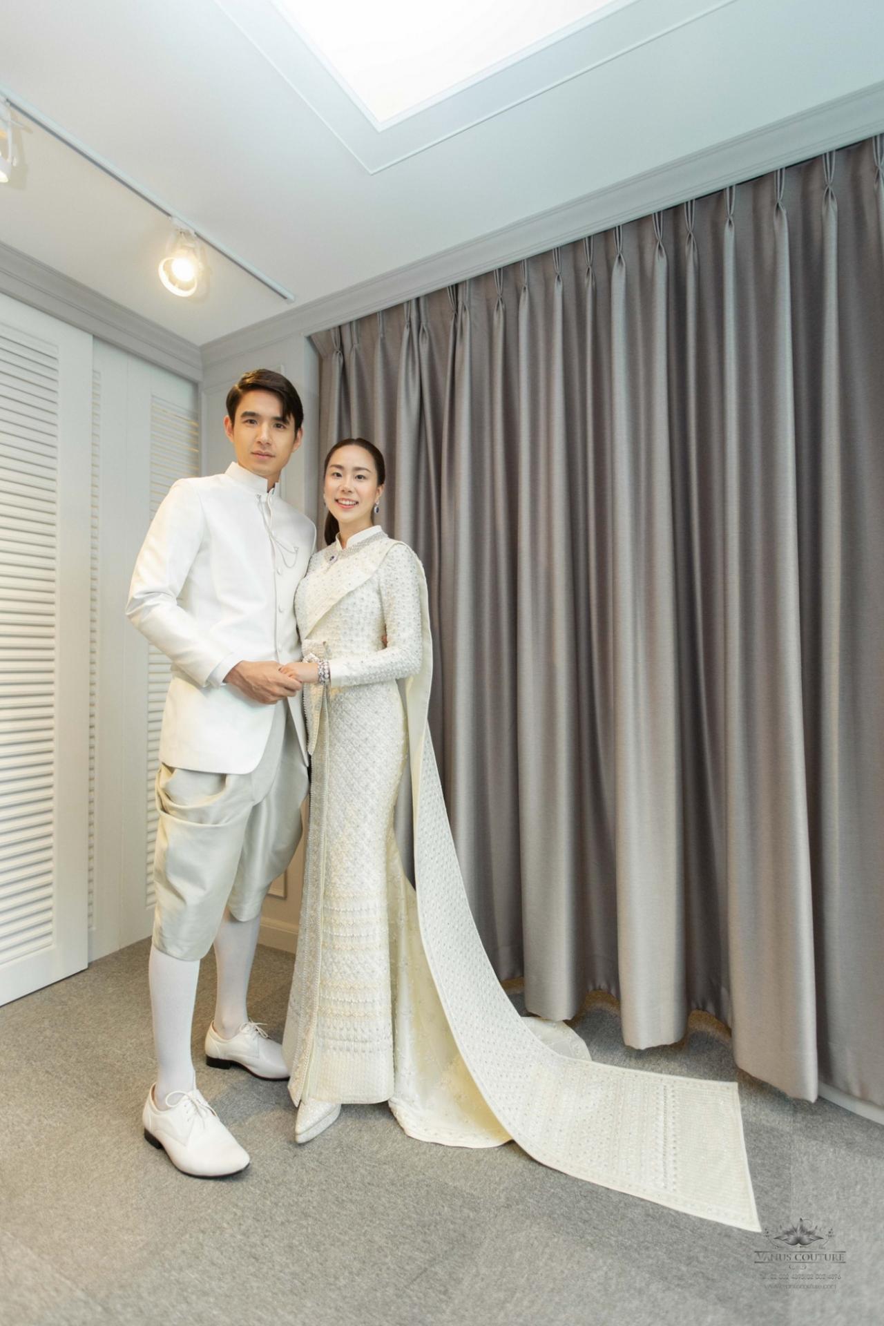ตามมาด้วยชุดไทยประยุกต์ของเจ้าบ่าว ถึงแม้ว่าเราจะคุ้นตาที่ได้เห็นพระเอกหนุ่มใส่ชุดไทยอยู่บ่อยครั้ง แต่ครั้งนี้พิเศษต่างออกไป ออร่าของเจ้าบ่าวโดดเด่นสะดุดตามากๆ เสื้อที่เลือกใช้ถูกแบบทรงราชปะแตนสีขาว ส่วนโจงกระเบนนั้นใช้ผ้าไหมลำพูนสีงาช้างในการตัดเย็บเพื่อให้เข้ากันกับชุดของเจ้าสาว นับเป็นอีกหนึ่งชุดไทยสำหรับเจ้าบ่าวที่ดูสง่างามและสมบูรณ์แบบมากอีกหนึ่งชุดและเหมาะกับหนุ่มนิวมากทีเดียว
