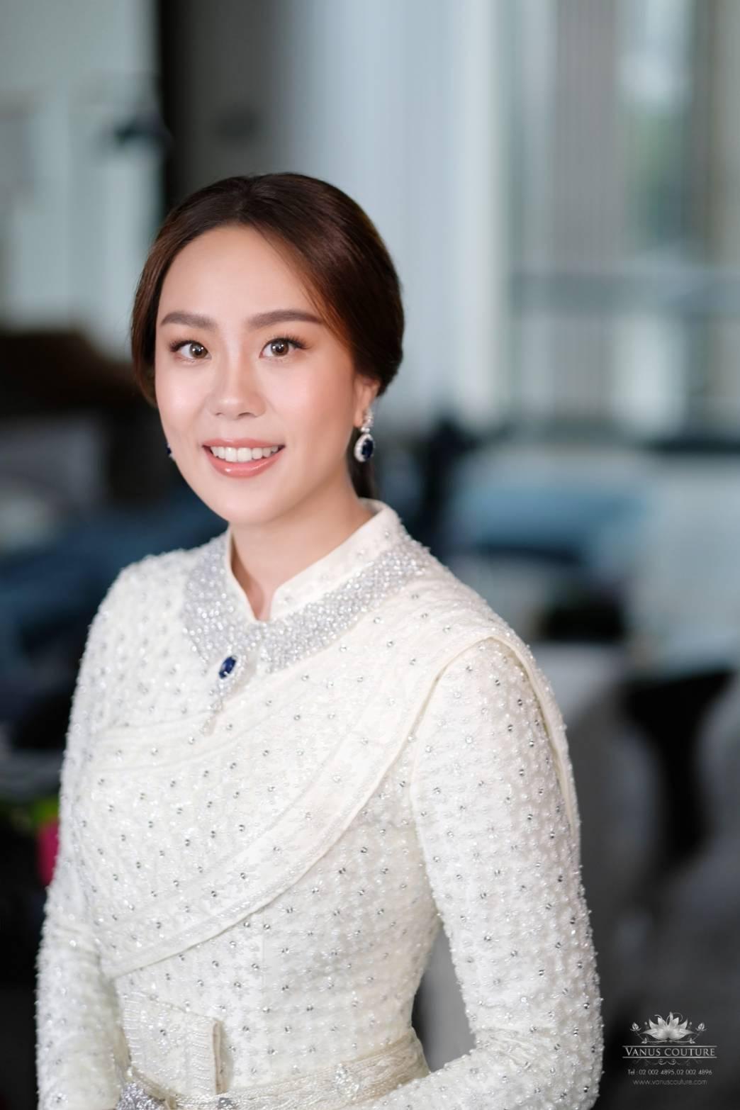ด้วยความพิเศษของชุดไทยประยุกต์ที่เจ้าสาวเลือกสวมใส่ในพิธีหมั้นครั้งนี้ มีต้นแบบมาจากชุดไทยศิวาลัย ที่รังสรรค์ขึ้นโดยห้องเสื้อชื่อดัง วนัช กูตูร์ โดย สรรค์ สุดเกตุ เจ้าของห้องเสื้อ ได้เลือกทอผ้าไหมยกดอกลำพูนสีขาวโทนงาช้าง และมีการสร้างลายขึ้นมาใหม่ มีความยาวกว่า 9 หลา เพื่อใช้ในการทำผลงานและเป็นอัตลักษณ์เพิ่มความเป็นสิริมงคลของคู่บ่าวสาว