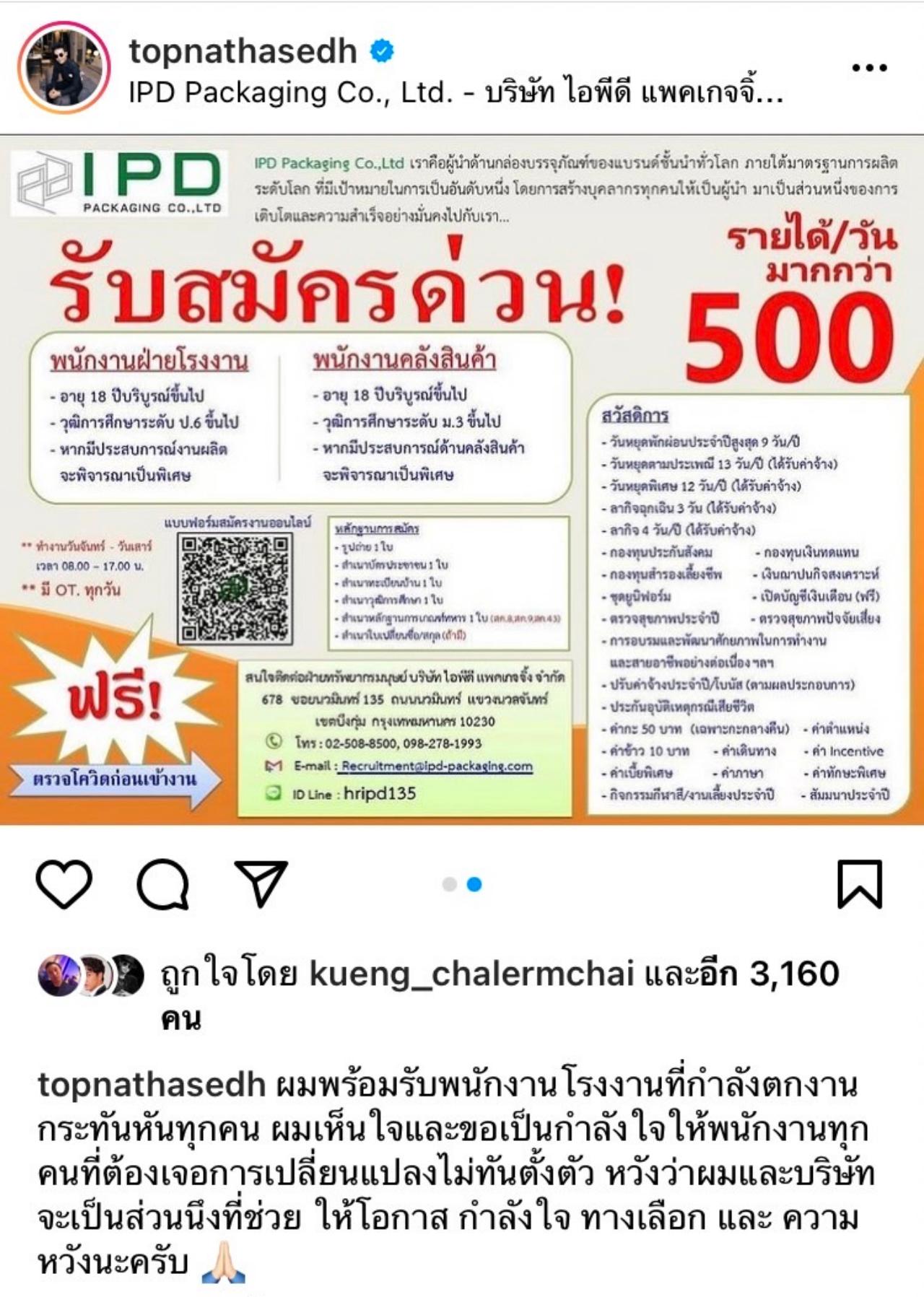 เพิ่งจะเปิดรับสมัครพนักงานเมื่อไม่นานมานี้ สำหรับ ท็อป ณัฐเศรษฐ์ พูนทรัพย์มณี พิธีกรชื่อดัง และยังเป็นหนึ่งในผู้บริหารบริษัท ไอพีดี แพคเกจจิ้ง จำกัด ที่ผลิตด้านกล่องบรรจุภัณฑ์ชั้นนำของโลก และล่าสุด ท็อป ก็ได้โพสต์ข้อความแจ้งข่าวประกาศรับสมัครพนักงานอีกครั้ง พร้อมกับแจ้งตำแหน่งที่ต้องการ แถมยังมีสวัสดิการให้ด้วย