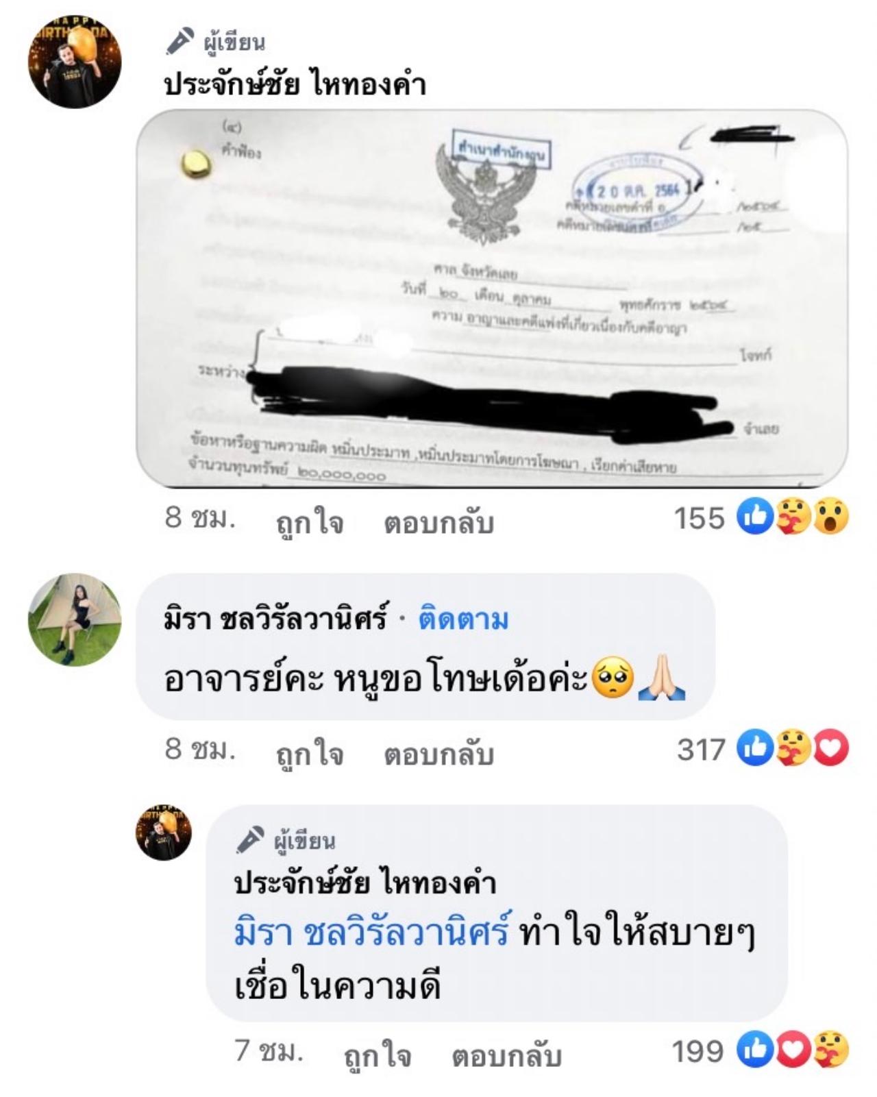 ต่อมา เอ๋ มิรา ก็ได้เข้ามาคอมเมนต์ขอโทษอาจารย์ประจักษ์ชัย บอกว่า "อาจารย์คะ หนูขอโทษเด้อค่ะ" และนายห้างได้ตอบกลับว่า "ทำใจให้สบายๆ เชื่อในความดี"