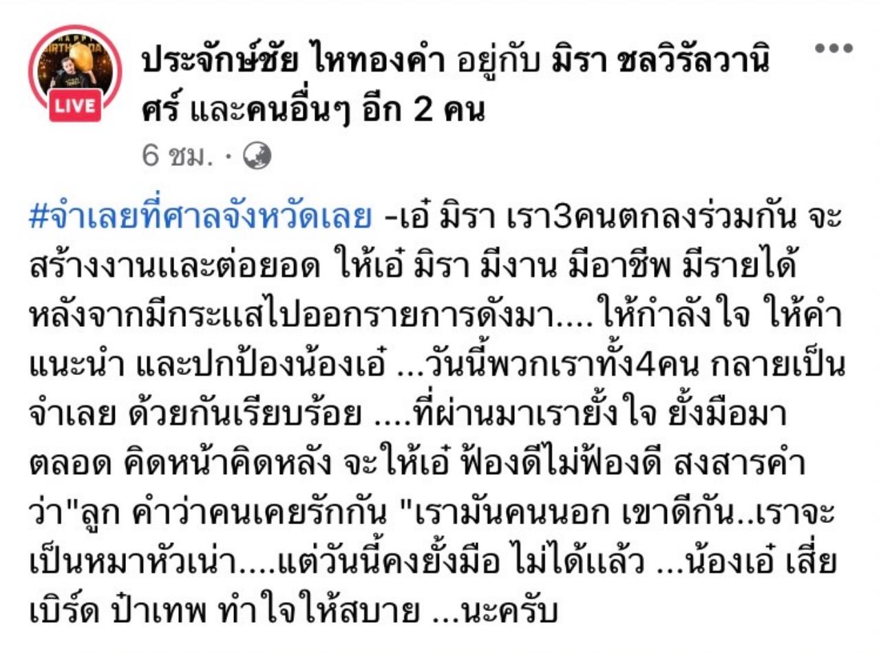 จากนั้นก็ได้โพสต์ภาพหมายศาลที่ส่งมาที่บ้าน พร้อมเขียนข้อความว่า "#จำเลยที่ศาลจังหวัดเลย เอ๋ มิรา เรา3คนตกลงร่วมกัน จะสร้างงานเเละต่อยอด ให้เอ๋ มิรา มีงาน มีอาชีพ มีรายได้หลังจากมีกระเเสไปออกรายการดังมาให้กำลังใจ ให้คำแนะนำ และปกป้องน้องเอ๋