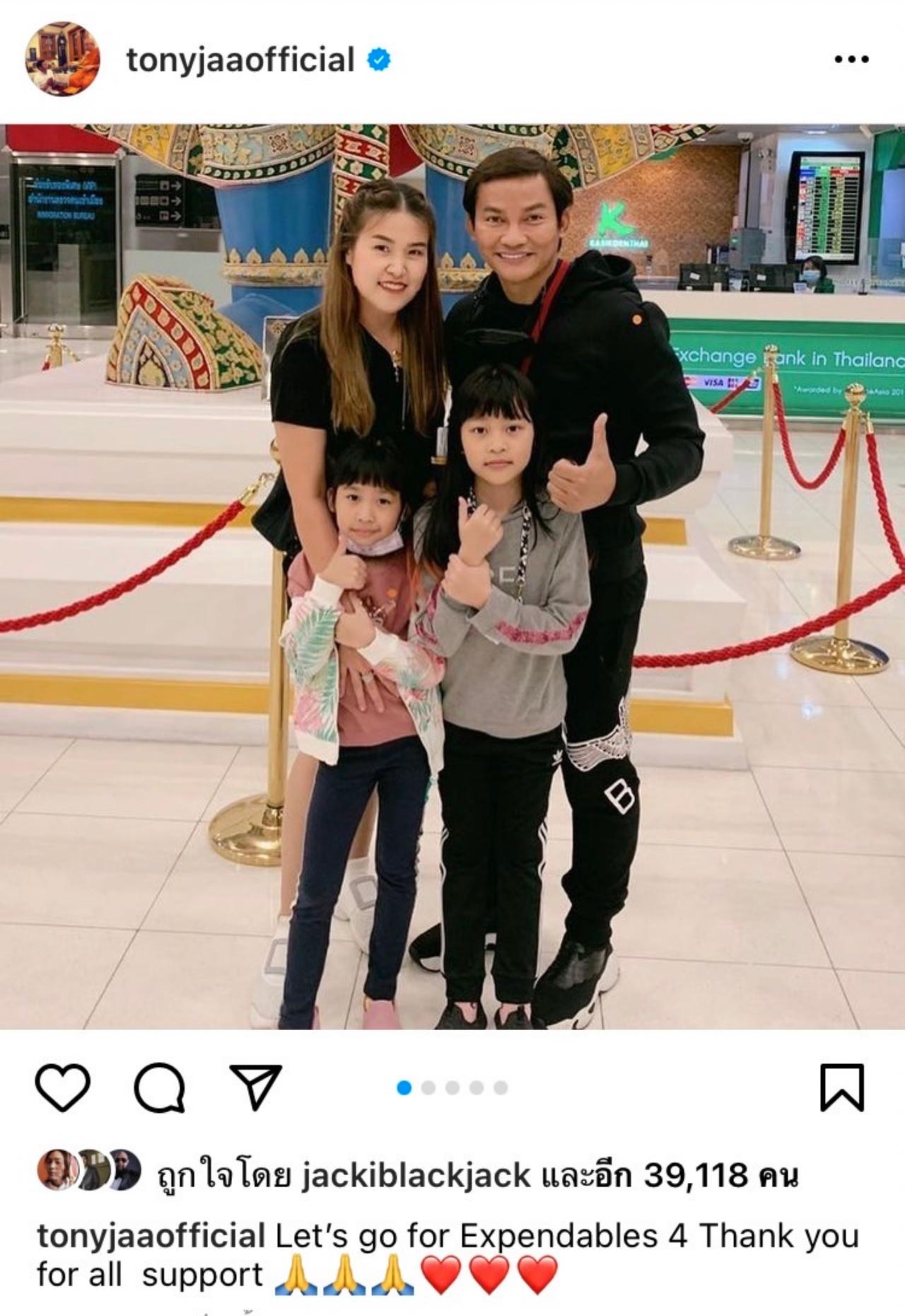 โดย จา พนม ได้โพสต์ภาพครอบครัวมาส่งขึ้นเครื่องบินที่สนามบินสุวรรณภูมิ พร้อมเขียนแคปชั่นว่า "Let’s go for Expendables 4 Thank you for all support"
