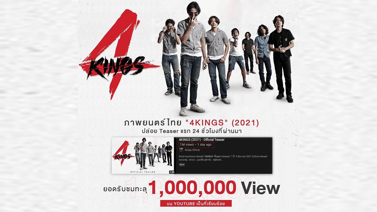 เรียกว่าเป็นภาพยนตร์ที่กำลังได้รับความสนใจเป็นอย่างมาก กระแสปังสุดๆ ในนาทีนี้ ต้องยกให้ภาพยนตร์เรื่อง “4KINGS” เพราะเพียงแค่ปล่อยทีเซอร์แรกออกไปได้ไม่เท่าไร ยอดวิวก็พุ่งทะลุล้านวิวภายใน 24 ชั่วโมงแล้ว