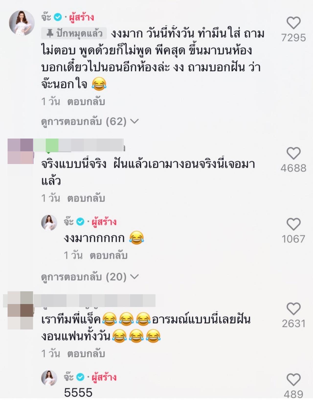 และนักร้องสาวก็ยังได้เขียนแคปชั่นบรรยายคลิปเอาไว้ว่า "งงมาก วันนี้ทั้งวัน ทำมึนใส่ ถามไม่ตอบ พูดด้วยก็ไม่พูด พีกสุด ขึ้นมาบนห้อง บอกเดี๋ยวไปนอนอีกห้องล่ะ งง ถามบอกฝันว่าจ๊ะนอกใจ"