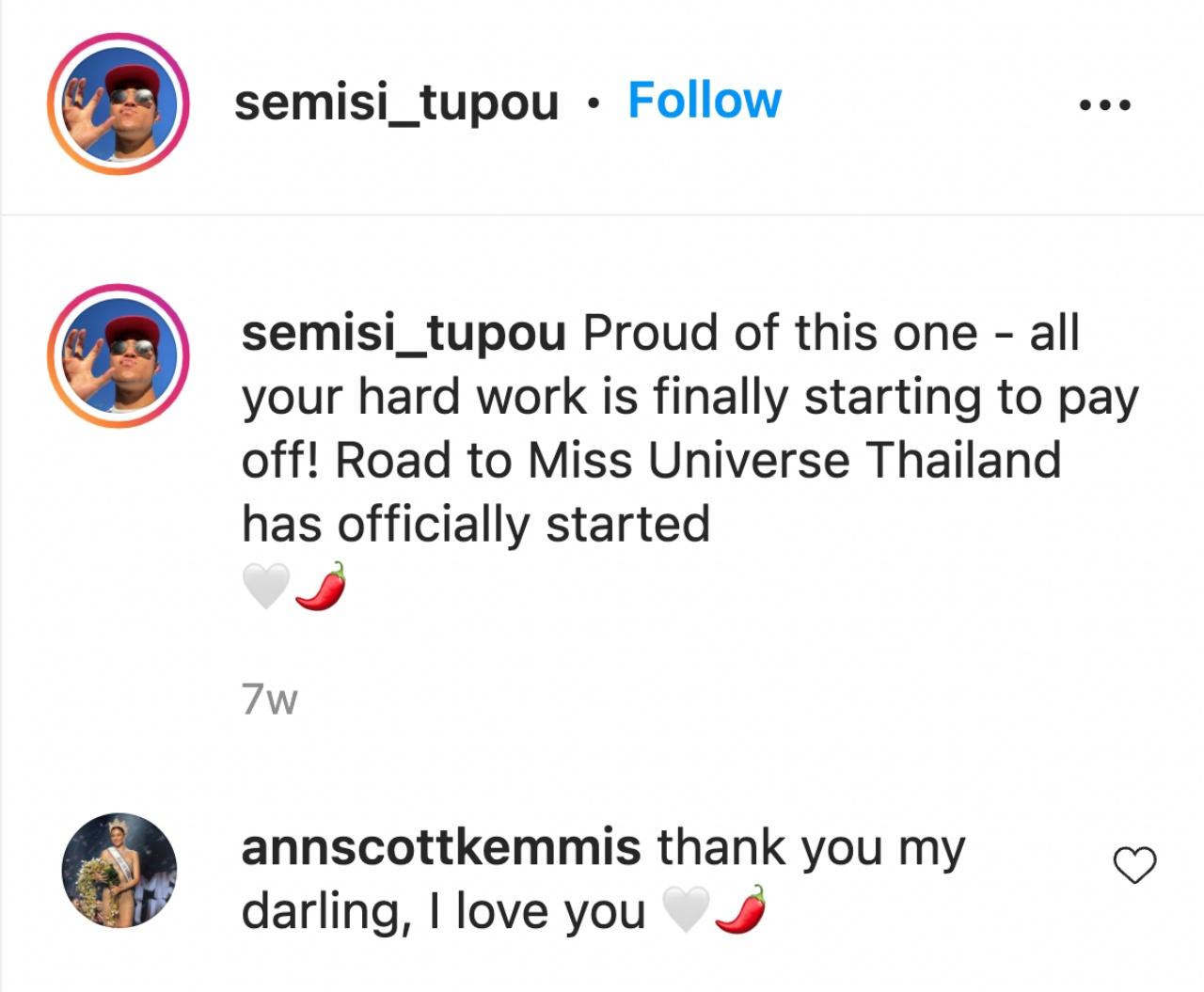 ช่วงก่อนจะได้มง เซมิมู ตูปู Semisi Tupou เพื่อนสุดสนิท ก็ได้โพสต์ไอจีที่ semisi_tupou ไว้ว่า Proud of this one - all your hard work is finally starting to pay off! Road to Miss Universe Thailand has officially started และมีรูปหัวใจและพริกอีกด้วย แปลได้ประมาณว่า ภูมิในตัวคุณ หลังจากที่ทำงานหนักมา ในที่สุด คุณก็ได้เริ่มอย่างเป็นทางการ กับเส้นทางการประกวด มิสยูนิเวิร์สไทยแลนด์