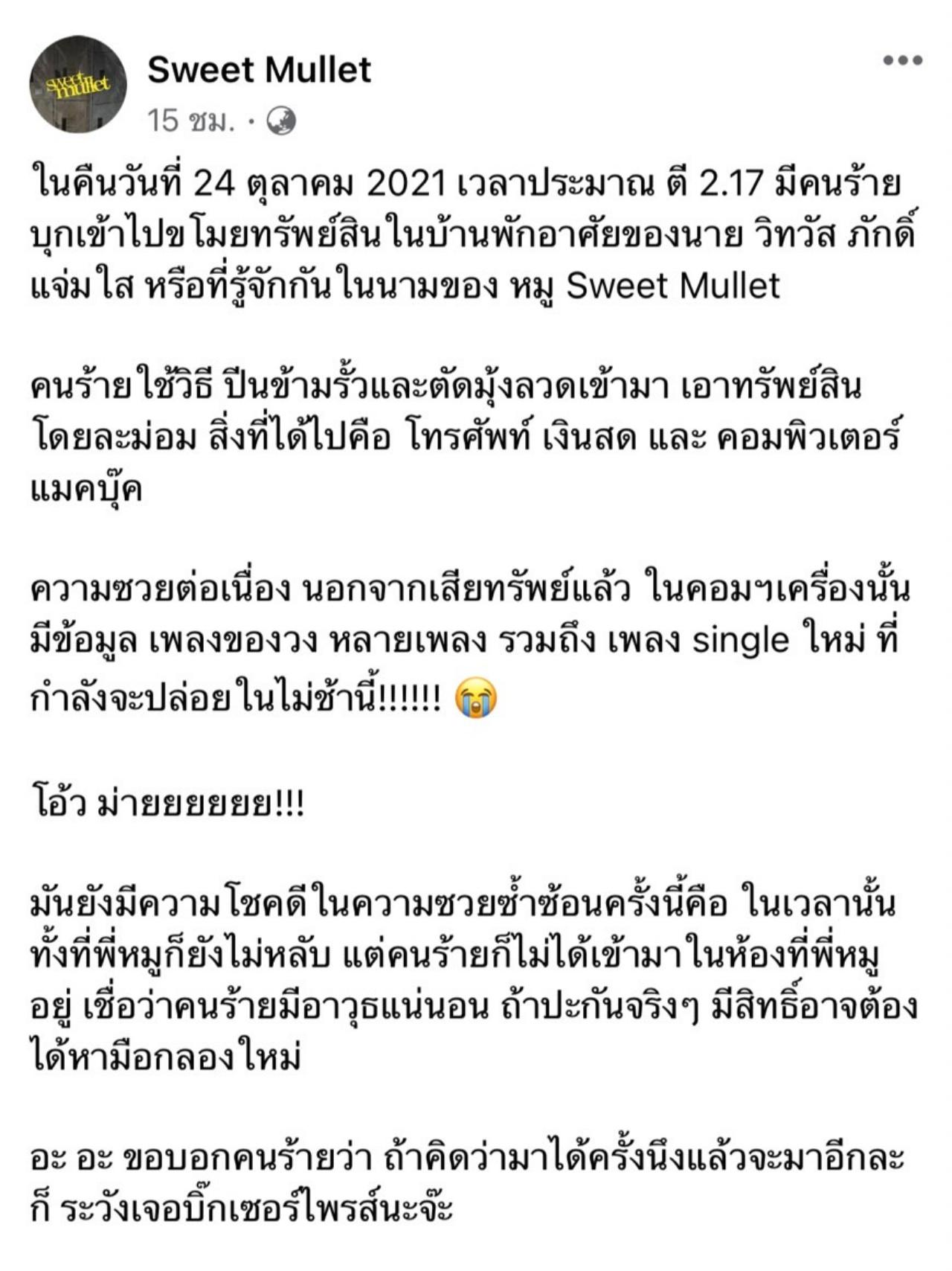 โดยเพจได้ให้รายละเอียดว่า “ในคืนวันที่ 24 ตุลาคม 2021 เวลาประมาณ ตี 2.17 มีคนร้ายบุกเข้าไปขโมยทรัพย์สินในบ้านพักอาศัยของนาย วิทวัส ภักดิ์แจ่มใส หรือที่รู้จักกันในนามของ หมู Sweet Mullet คนร้ายใช้วิธีปีนข้ามรั้วและตัดมุ้งลวดเข้ามา เอาทรัพย์สินโดยละม่อม สิ่งที่ได้ไปคือ โทรศัพท์ เงินสด และ คอมพิวเตอร์แมคบุ๊ค