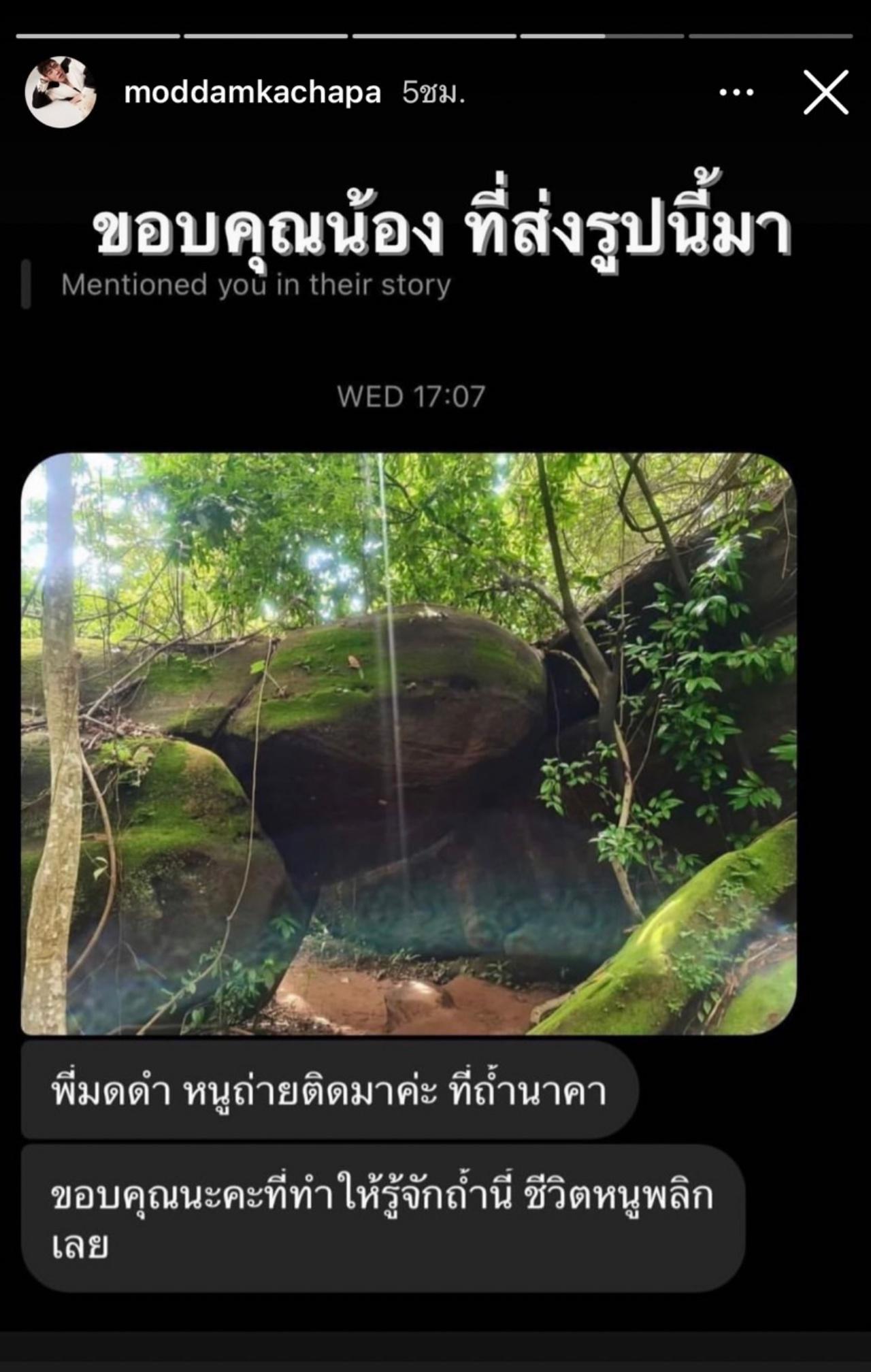 แต่ล่าสุด มดดำ ได้โพสต์ภาพชวนขนลุกผ่านไอจีสตอรี่ของตัวเอง เป็นภายถ่ายที่คล้ายเงาพญานาคติดมาด้วย โดยผู้ที่ส่งภาพนี้ส่งข้อความมาบอกกับมดดำว่า "ขอบคุณนะคะที่ทำให้รู้จักถ้ำนี้ ชีวิตหนูพลิกเลย"