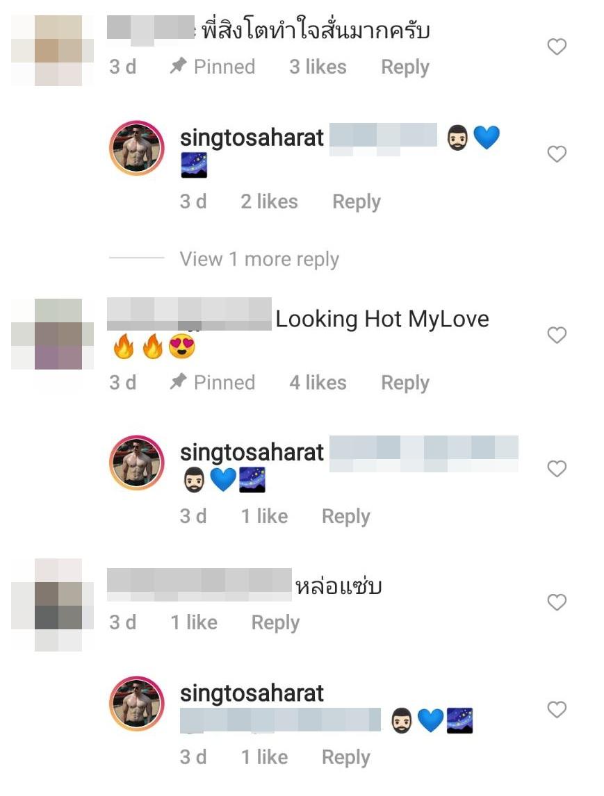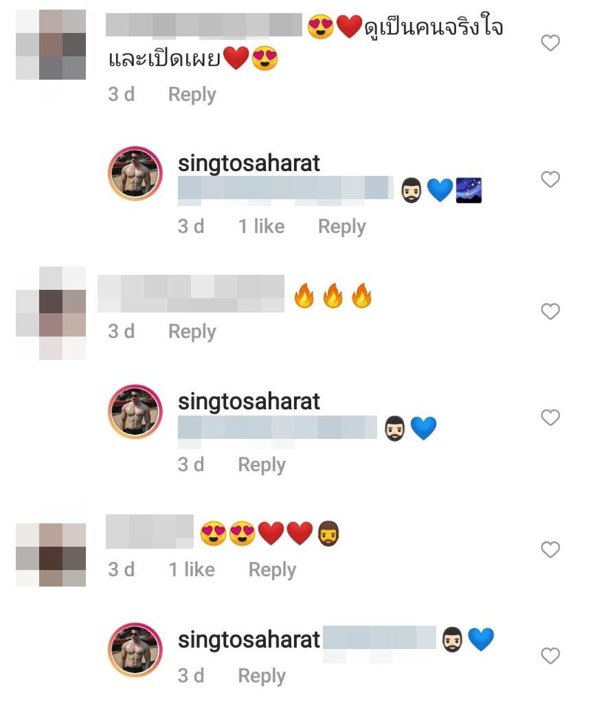 งานนี้นอกจากจะมีแฟนๆ เข้ามาส่งอีโมจิหัวใจกับไฟลุกเต็มไอจีแล้ว ยังมีคอมเมนต์แซวหลากหลายข้อความ อาทิ พี่สิงโตทำใจสั่นมากครับ, หล่อแซ่บ, ดูเป็นคนจริงใจและเปิดเผย ฯลฯ