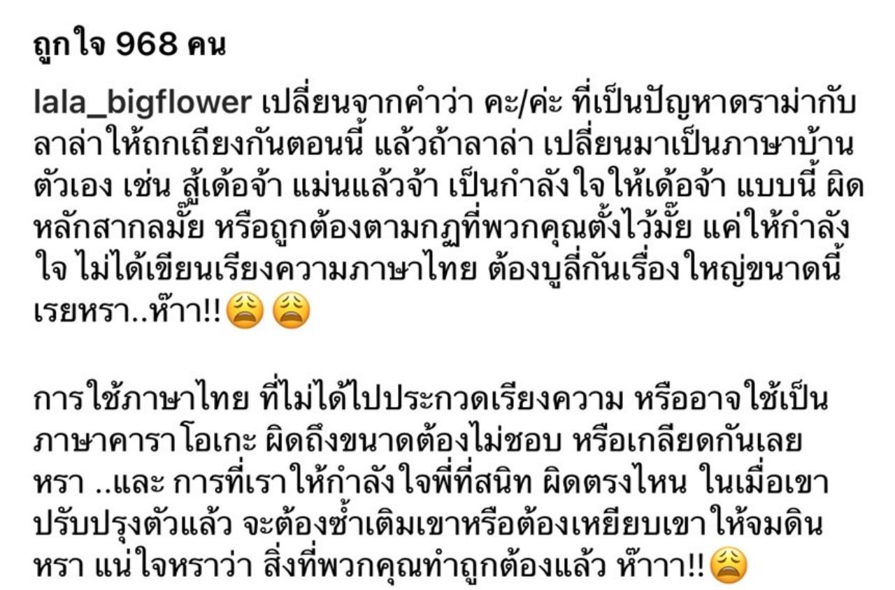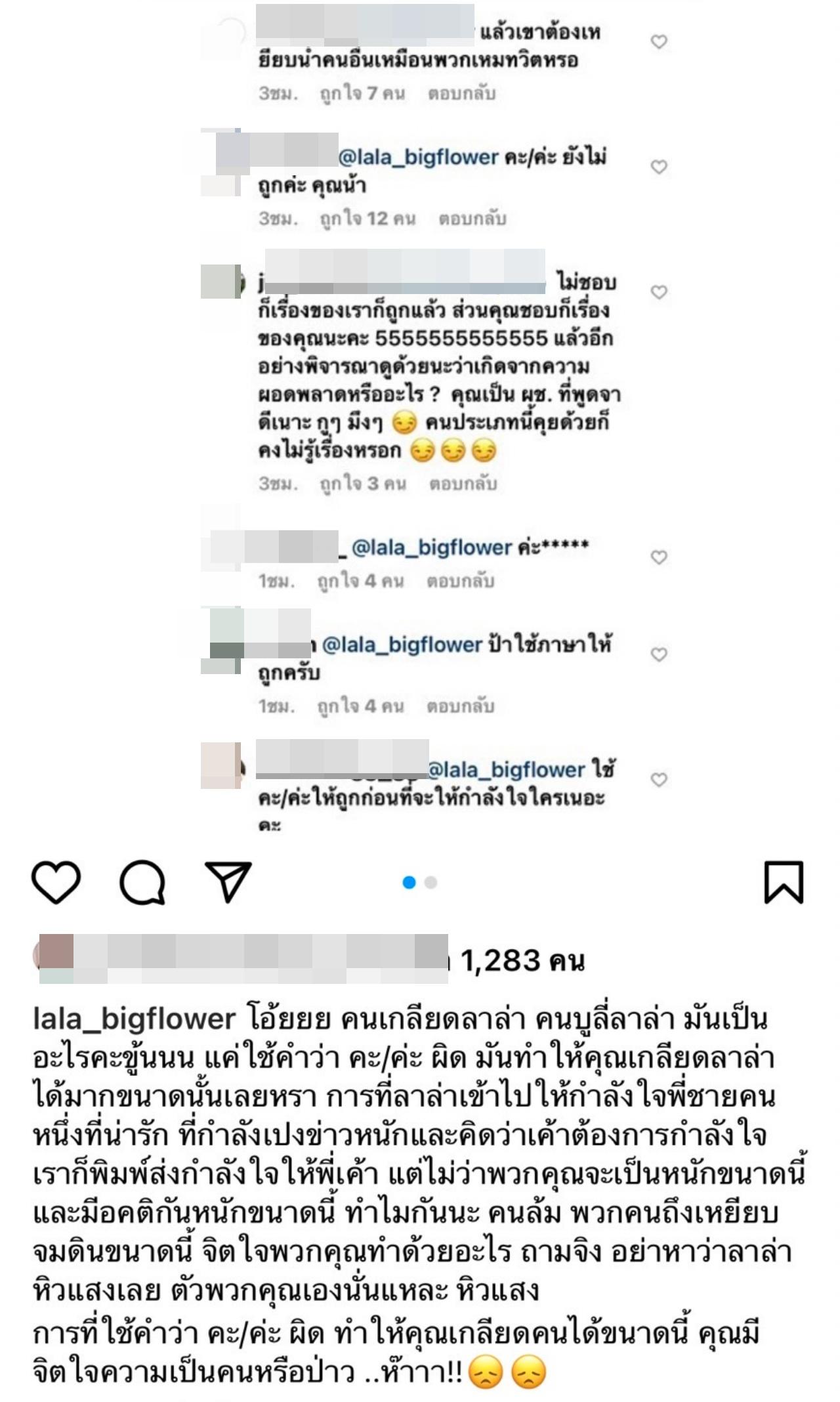 "โอ้ยยย คนเกลียดลาล่า คนบูลลี่ลาล่า มันเป็นอะไรคะขู้นนน แค่ใช้คำว่า คะ/ค่ะ ผิด มันทำให้คุณเกลียดลาล่าได้มากขนาดนั้นเลยหรา การที่ลาล่าเข้าไปให้กำลังใจพี่ชายคนหนึ่งที่น่ารัก ที่กำลังเป็นข่าวหนักและคิดว่าเค้าต้องการกำลังใจ เราก็พิมพ์ส่งกำลังใจให้พี่เค้า