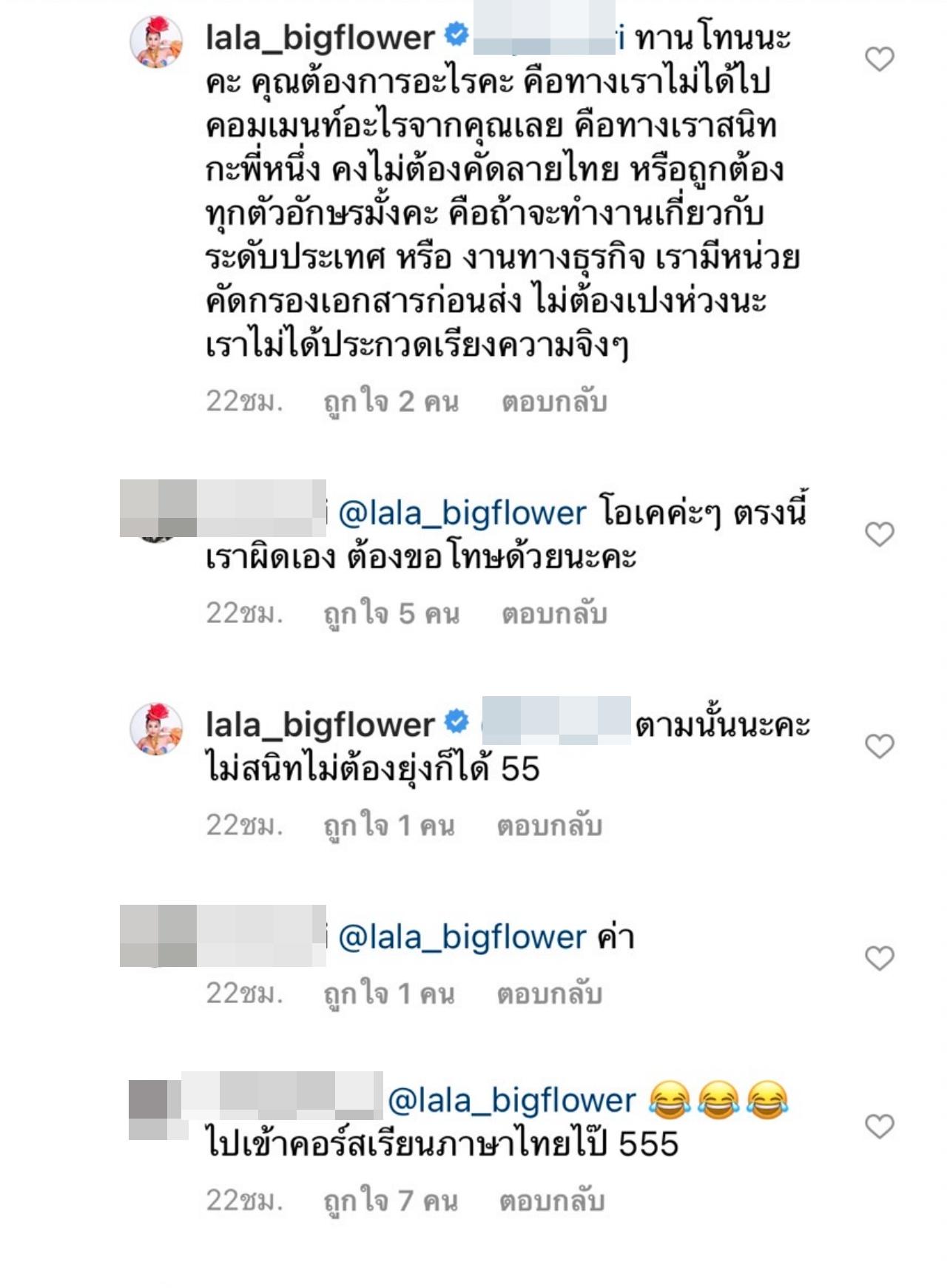 จากนั้น ลาล่า ก็ได้ตอบกลับอีกว่า "ทานโทนนะคะ คุณต้องการอะไรคะ คือทางเราไม่ได้ไปคอมเมนท์อะไรจากคุณเลย คือทางเราสนิทกะพี่หนึ่ง คงไม่ต้องคัดลายไทย หรือถูกต้องทุกตัวอักษรมั้งคะ คือถ้าจะทำงานเกี่ยวกับระดับประเทศ หรืองานทางธุรกิจ เรามีหน่วยคัดกรองเอกสารก่อนส่ง ไม่ต้องเปงห่วงนะ เราไม่ได้ประกวดเรียงความจิงๆ"