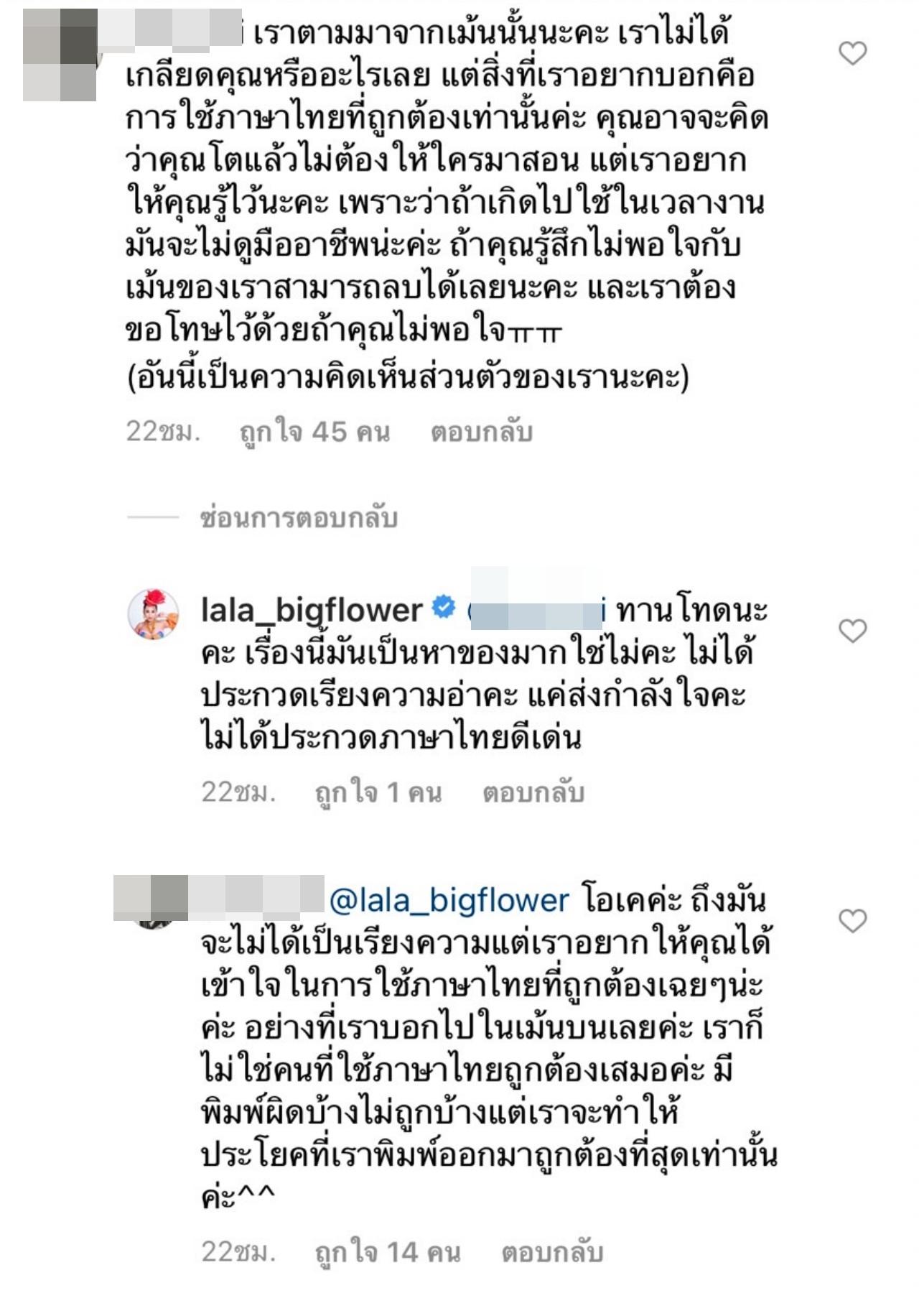 จากนั้น ก็มีชาวเน็ตคนหนึ่งได้เข้ามาคอมเมนต์บอกว่าตัวเองนั้นไม่ได้เกลียดอะไร ลาล่า แค่อยากให้ใช้ภาษาไทยให้ถูกต้องว่า "เราตามมาจากเม้นนั้นนะคะ เราไม่ได้เกลียดคุณหรืออะไรเลย แต่สิ่งที่เราอยากบอกคือการใช้ภาษาไทยที่ถูกต้องเท่านั้นค่ะ
