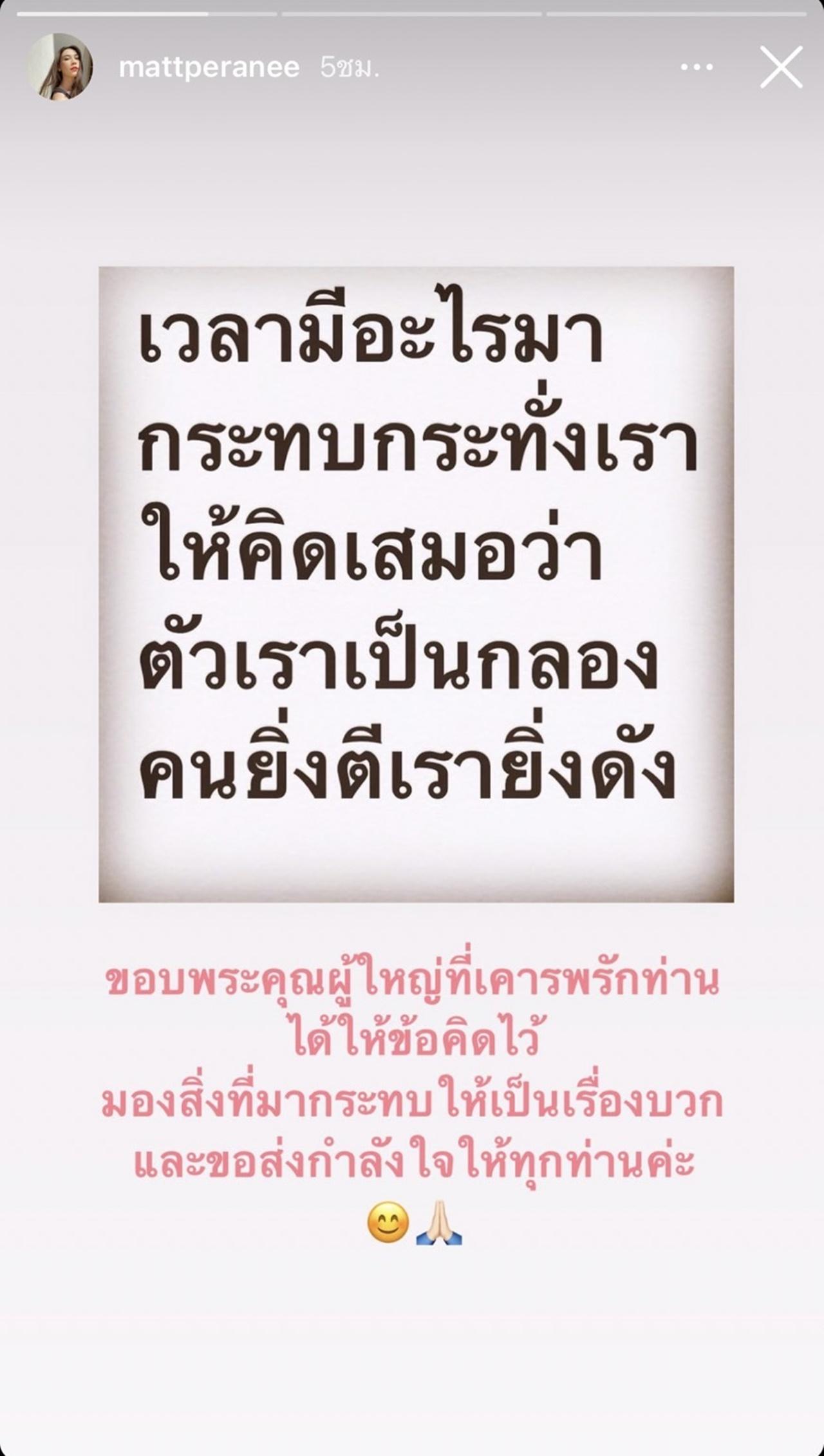 ซึ่งสาวแมทก็ได้เขียนข้อความเอาไว้ว่า "ขอบพระคุณผู้ใหญ่ที่เคารพรักท่านได้ให้ข้อคิดไว้ มองสิ่งที่มากระทบให้เป็นเรื่องบวกและขอส่งกำลังใจให้ทุกท่านค่ะ"
