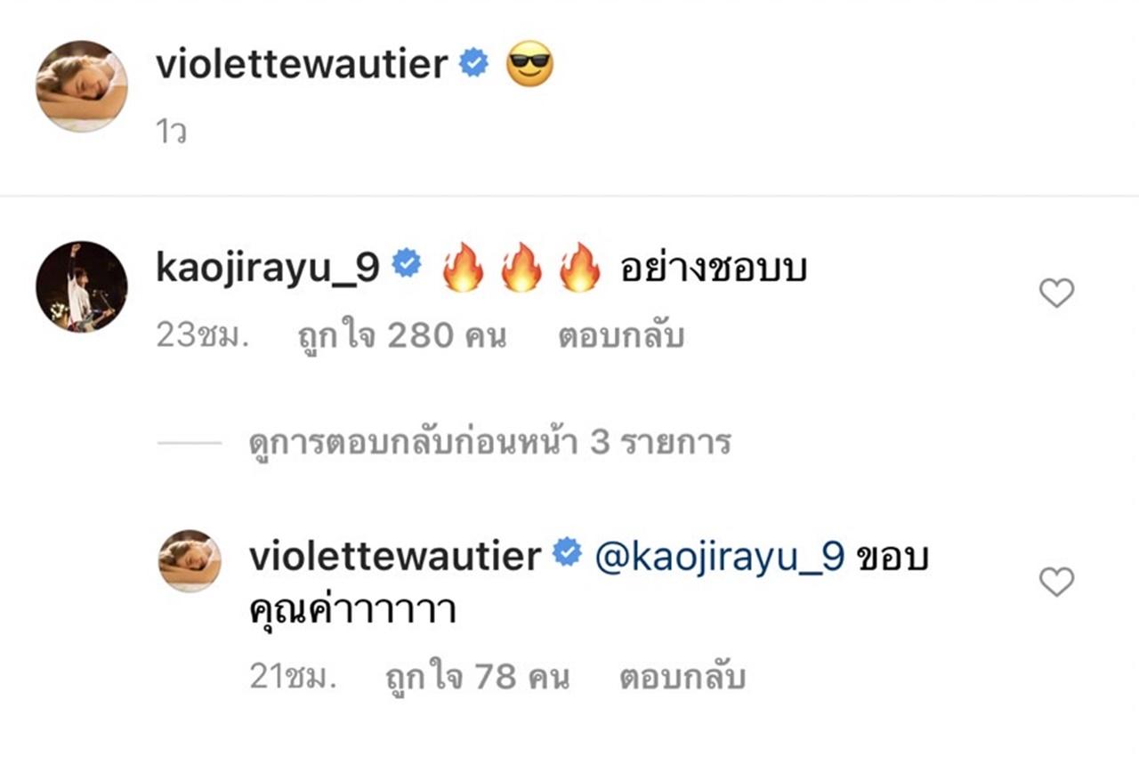 ซึ่งทางด้าน วี วิโอเลต ก็มาคอมเมนต์ตอบแฟนหนุ่มว่า "ขอบคุณค่าาาาาา" งานนี้ก็มีแฟนๆ ของทั้งคู่เข้ามาแซวว่า หนุ่มเก้านั้นคอมเมนต์เหมือนประชดแฟนสาวอีกด้วย แต่สวยแซ่บขนาดนี้ไม่ชอบก็ไม่รู้จะว่ายังไงแล้ว.