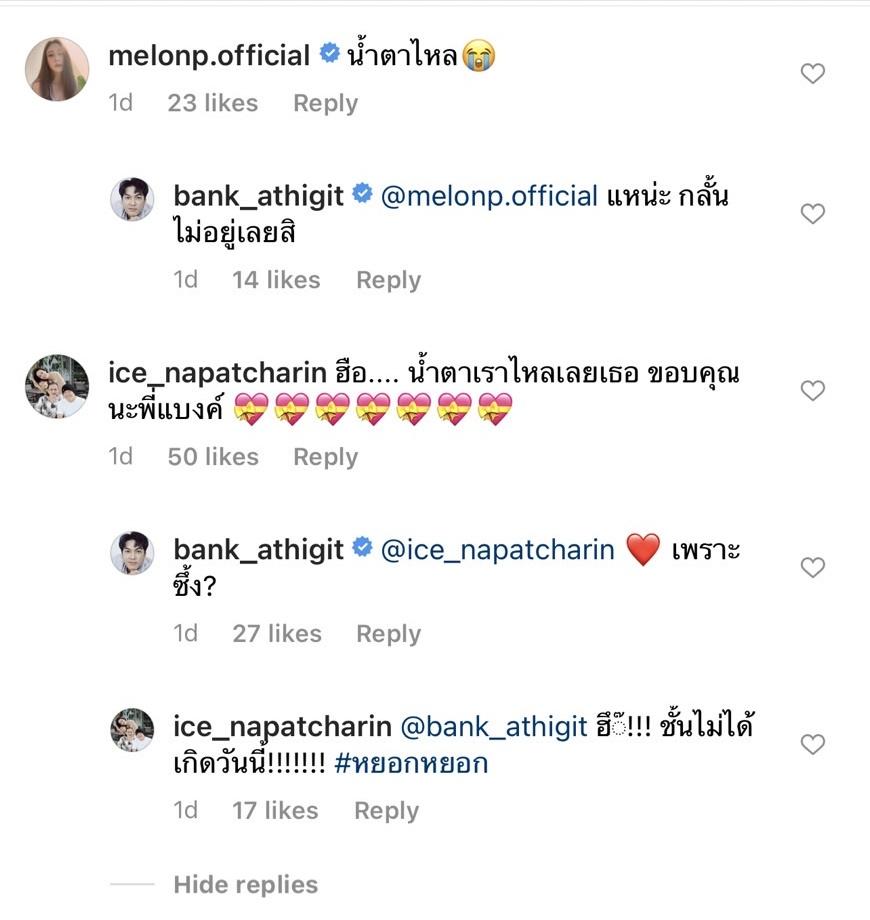 ซึ่งหลังจากที่แบงค์อวยพรวันเกิดไอซ์ ไอซ์ก็ได้เข้ามาคอมเมนต์ตอบกลับว่า "ฮือ.... น้ำตาเราไหลเลยเธอ ขอบคุณนะพี่แบงค์" ส่วนนักแสดงสาว แตงโม นิดา ก็คอมเมนต์ว่า "น้ำตาไหล" ด้วย.