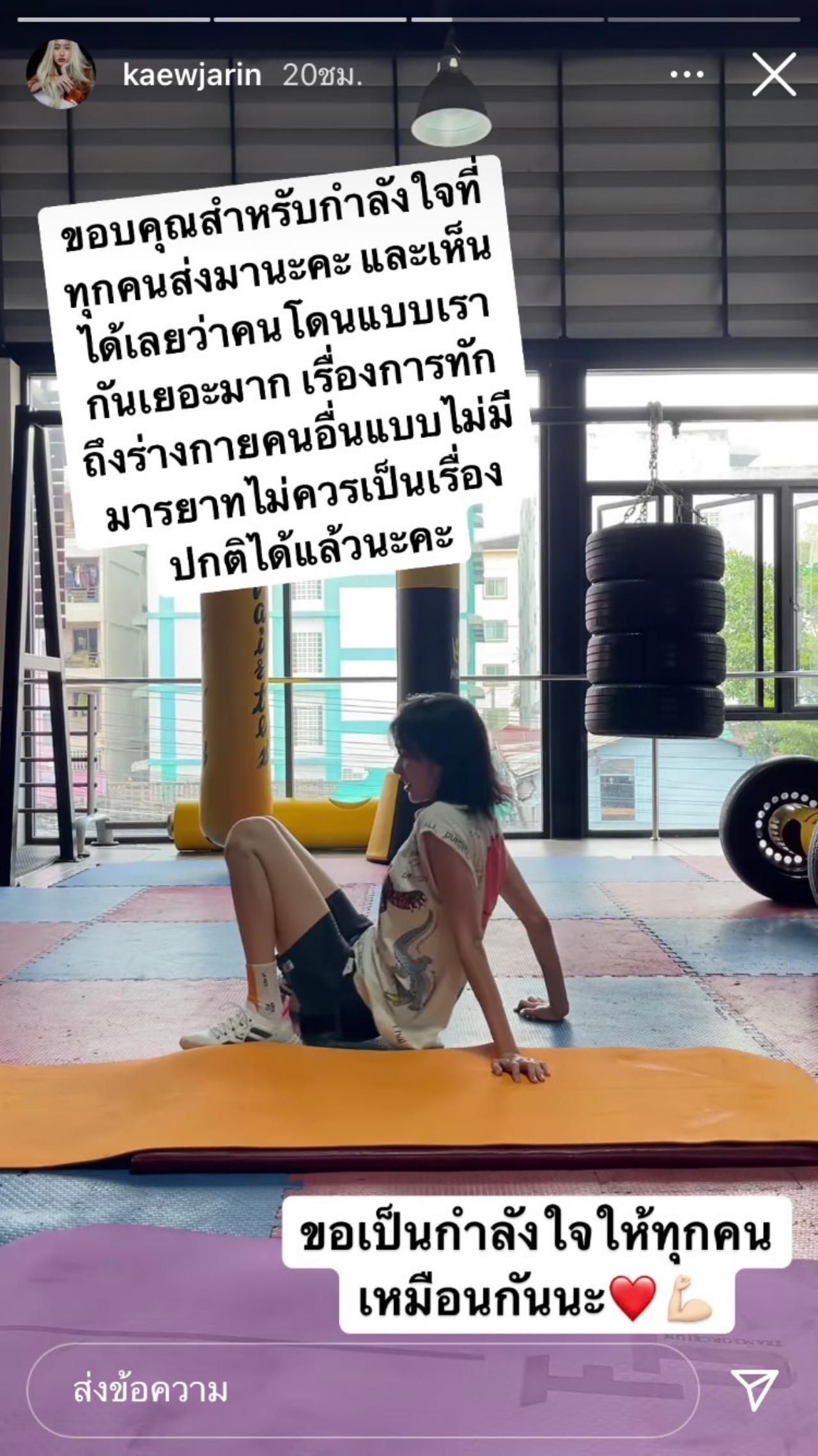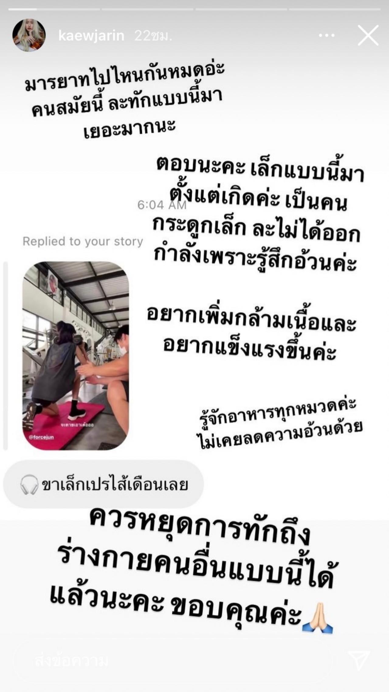 ด้าน แก้ว เลยขอตอกกลับแบบตรงๆ พร้อมอธิบายว่า "มารยาทไปไหนกันหมดอ่ะ คนสมัยนี้ ละทักแบบนี้มาเยอะมากนะ ตอบนะคะ เล็กแบบนี้มาตั้งแต่เกิดค่ะ เป็นคนกระดูกเล็กและไม่ได้ออกกำลังเพราะรู้สึกอ้วนค่ะ