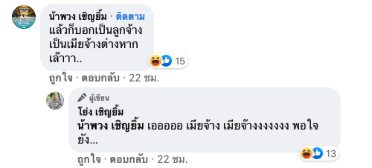 ด้าน น้าพวง เชิญยิ้ม ก็ได้เข้ามาคอมเมนต์ว่า "แล้วก็บอกเป็นลูกจ้าง เป็นเมียจ้างต่างหากเล๊าาา.." และ น้าโย่ง ก็ได้ตอบกลับว่า "เอออออ เมียจ้าง เมียจ๊างงงงงงง พอใจยัง…" ทำเอาแฟนคลับที่ติดตามต่างขำกับคอมเมนต์ของ น้าพวง เชิญยิ้ม และแฟนๆ ก็ได้ส่งกำลังใจมาให้กับ โย่ง เชิญยิ้ม กันเป็นจำนวนมาก.