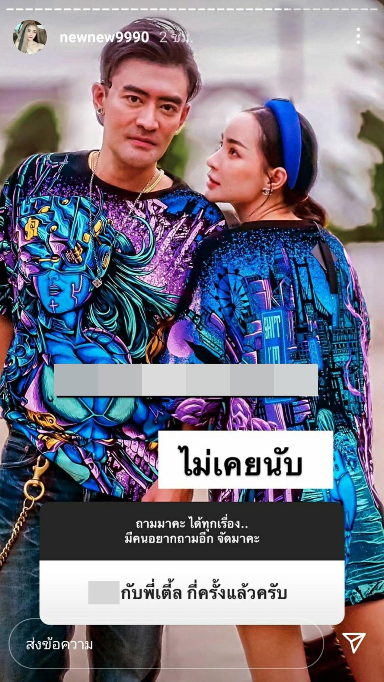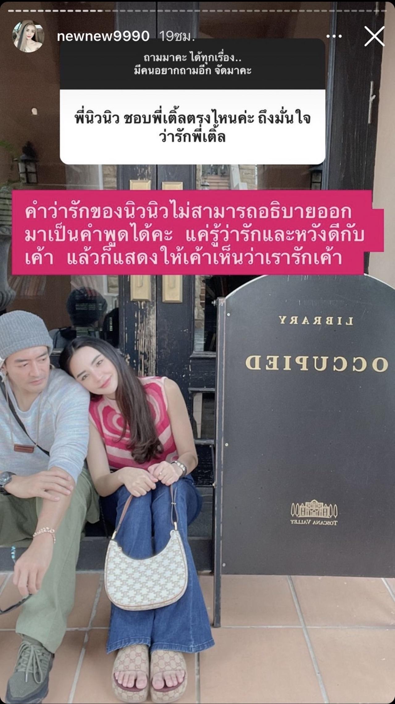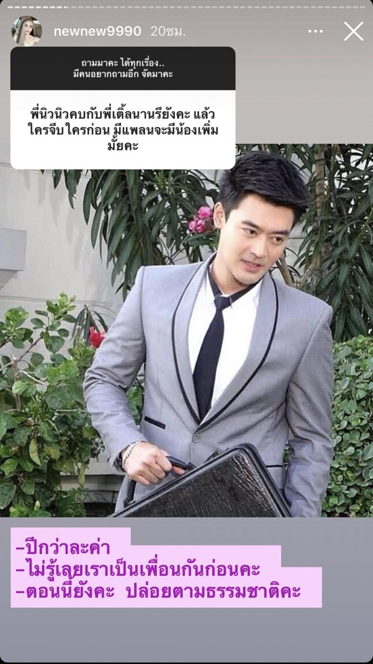 อีกหนึ่งคำถามที่เจ้าตัวเลือกมาคือ "พี่นิวนิวคบกับพี่เติ้ลนานรึยังคะ แล้วใครจีบใครก่อน มีแพลนจะมีน้องเพิ่มมั้ยคะ" งานนี้นิวนิวก็ตอบคำถามนี้ว่า "ปีกว่าละค่า ไม่รู้เลยเราเป็นเพื่อนกันก่อนค่ะ ตอนนี้ยังค่ะ ปล่อยตามธรรมชาติค่ะ"