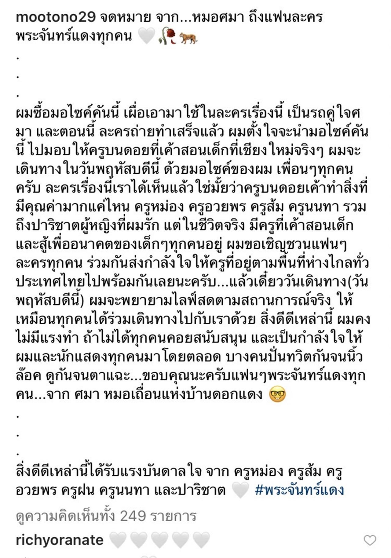 "จดหมาย จาก...หมอศมา ถึงแฟนละครพระจันทร์แดงทุกคน ผมซื้อมอไซค์คันนี้ เผื่อเอามาใช้ในละครเรื่องนี้ เป็นรถคู่ใจศมา และตอนนี้ ละครถ่ายทำเสร็จแล้ว ผมตั้งใจจะนำมอไซค์คันนี้ ไปมอบให้ครูบนดอยที่เค้าสอนเด็กที่เชียงใหม่จริงๆ ผมจะเดินทางในวันพฤหัสบดีนี้ ด้วยมอไซค์ของผม