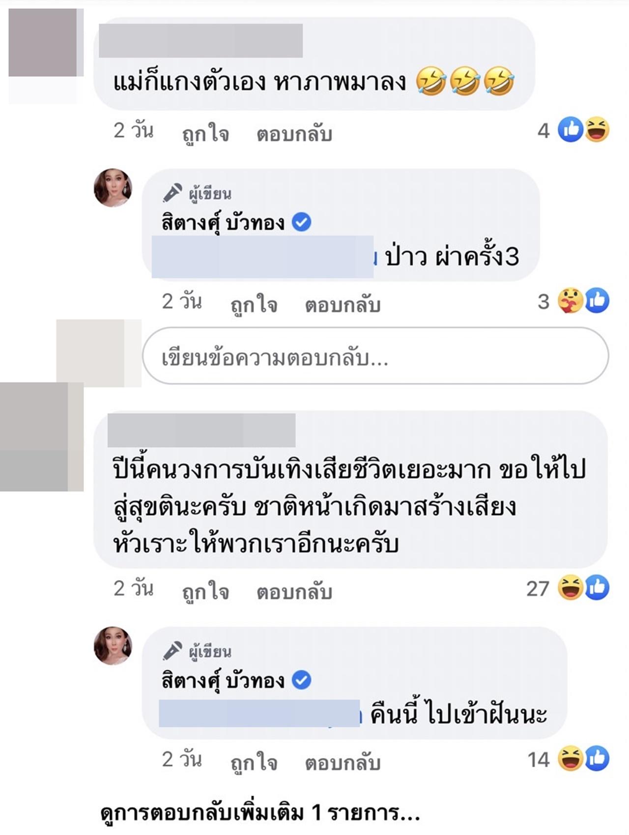 หลังจากที่ทำเอาแฟนๆ เข้าใจผิด สิตางศุ์ บัวทอง เน็ตไอดอลรุ่นใหญ่ ก็ได้เข้ามาตอบคอมเมนต์ให้แฟนๆ โล่งใจทันทีว่า เป็นภาพเมื่อตอนที่ผ่าครั้งที่ 3 พร้อมกับตอบขำๆ เมื่อคนโพสต์อาลัยว่าคืนนี้ไปเข้าฝันนะ อีกด้วย แม้จะถูกแซวแรงแต่แม่สิตางศุ์ก็ยังมีอารมณ์ดีกับแฟนๆ อยู่เสมอ