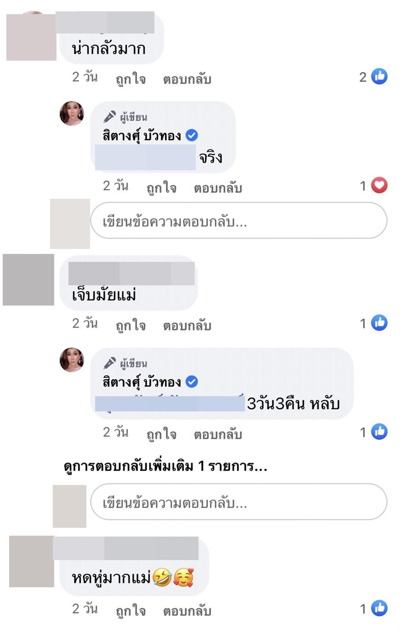 และหลังจากที่แม่สิตางศุ์โพสต์รูปและเขียนแคปชั่นดังกล่าวไป งานนี้ทำเอาแฟนๆ ตกใจและคิดไปไกลเข้ามาคอมเมนต์ไว้อาลัยแม่สิตางศุ์มากมาย อาทิ