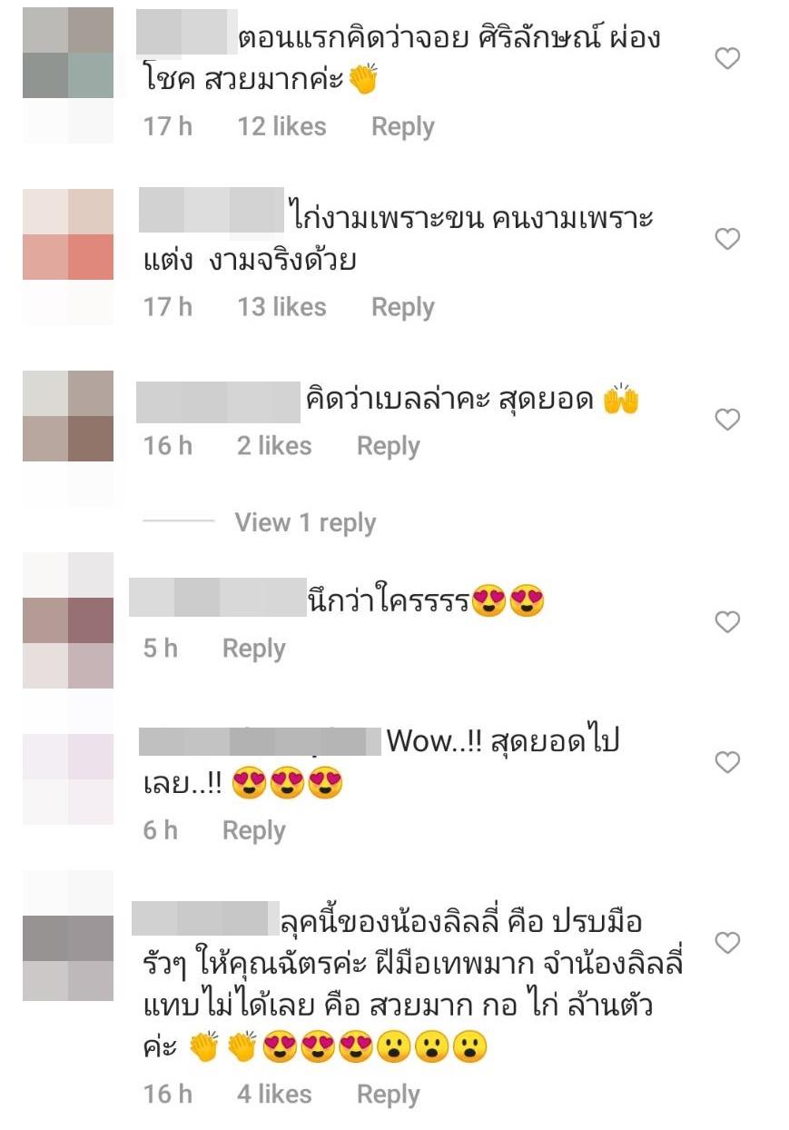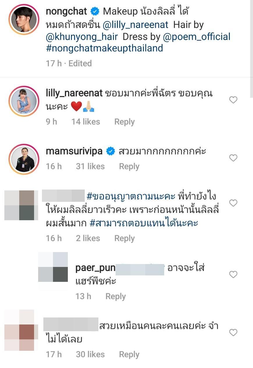 ซึ่งน้องฉัตรก็ได้โพสต์ภาพของลิลลี่ลงไอจี โดยมีแฟนๆ เข้ามาคอมเมนต์ชื่นชมความสวย อาทิ สวยเหมือนคนละคนเลยค่ะ จำไม่ได้เลย, ตอนแรกคิดว่าจอย ศิริลักษณ์ ผ่องโชค สวยมากค่ะ, ลุคนี้ของน้องลิลลี่ คือ ปรบมือรัวๆ ให้คุณฉัตรค่ะ ฝีมือเทพมาก จำน้องลิลลี่แทบไม่ได้เลย คือ สวยมาก กอ ไก่ ล้านตัวค่ะ, คิดว่าเบลล่าคะ สุดยอด ฯลฯ ด้านลิลลี่ก็ได้เข้ามาคอมเมนต์ว่า “ชอบมากค่ะพี่ฉัตร ขอบคุณนะคะ”.